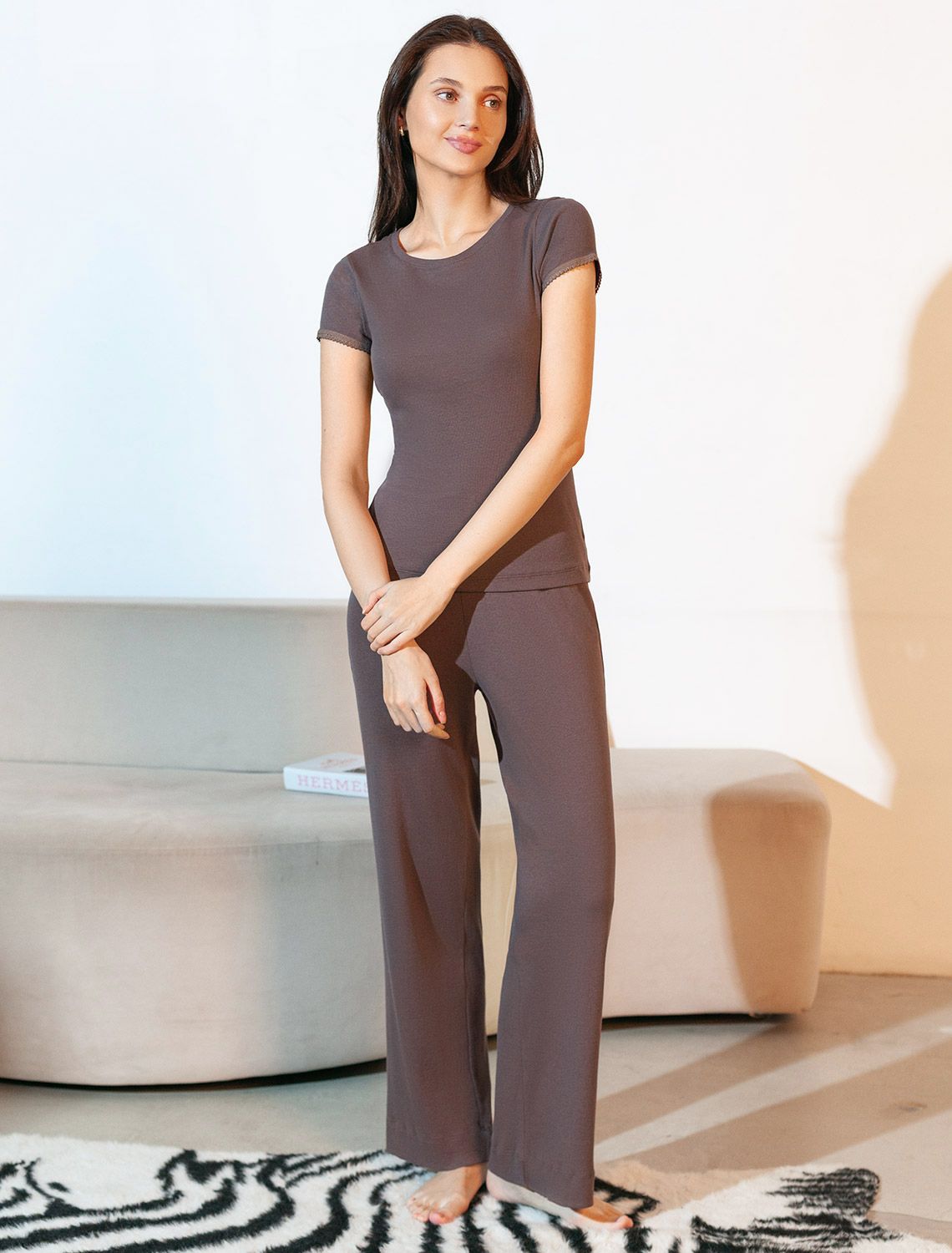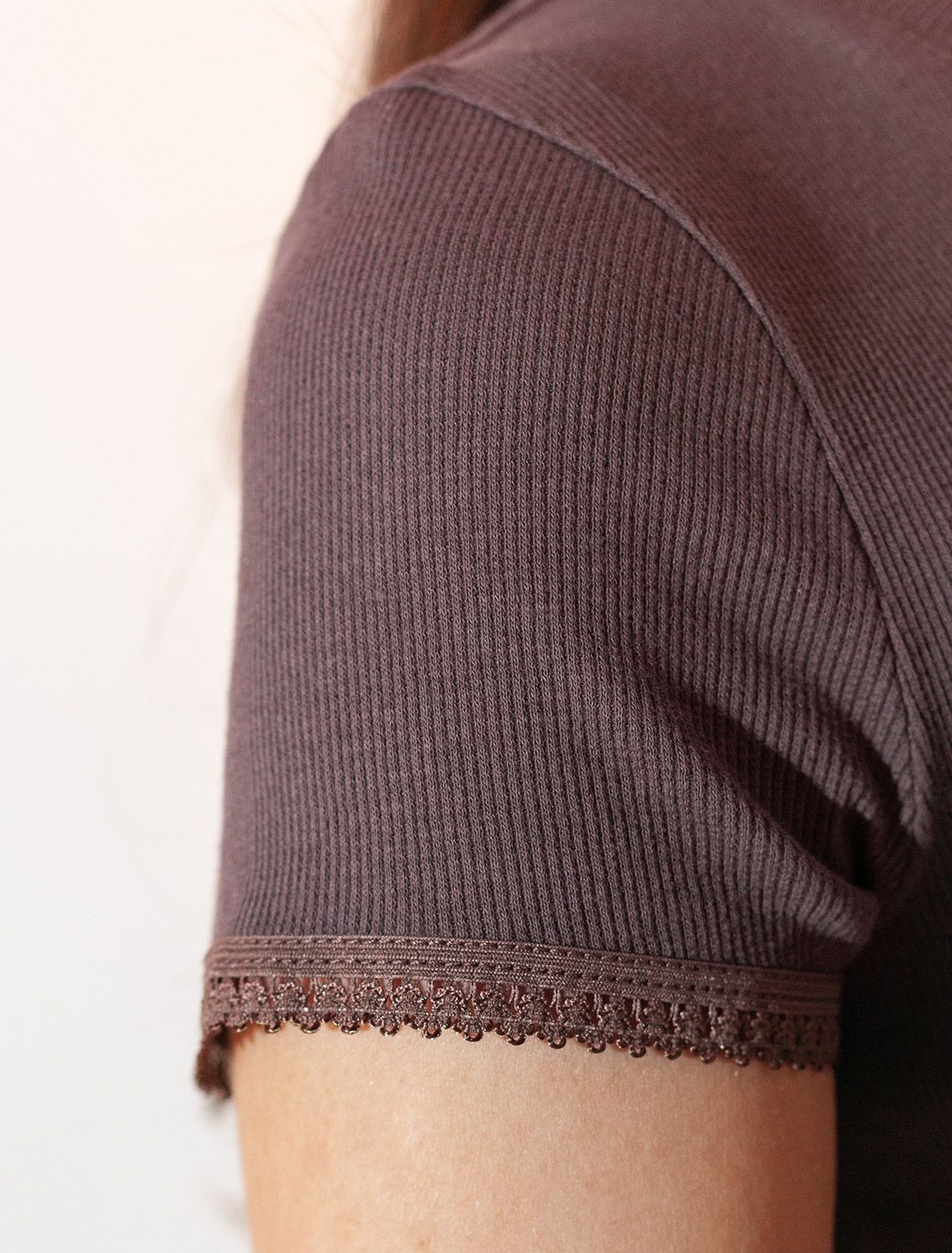 Футболка кофейного цвета с круглым вырезом изиз фактурного трикотажа в рубчик идеально сочетается с повседневным стилем и подходит для домашней носки или отдыха. Мягкое полотно из хлопка обеспечивает максимальный комфорт даже в течение длительного времени. Особенность этого изделия — эластичная структура ткани, благодаря чему она хорошо тянется и подстраивается под особенности фигуры. Короткие рукава делают модель легкой и универсальной. На рукавах отделка нежным кружевом в тон основного цвета добавляет нотку романтичности. Футболка подойдет для девушек и женщин, которые ценят уют и удобство. Нежная ткань приятна к телу, не вызывает дискомфорта и позволяет коже дышать, что особенно важно в повседневной жизни. Футболка в мелкий рубчик полуприлегающего кроя визуально вытягивает силуэт и делает фигуру более стройной. Разнообразие размеров позволяет выбрать подходящий вариант для любых параметров, в том числе на большие размеры. Эта красивая футболка практична и незаменима для тех, кто ищет качественные и стильные вещи на каждый день.