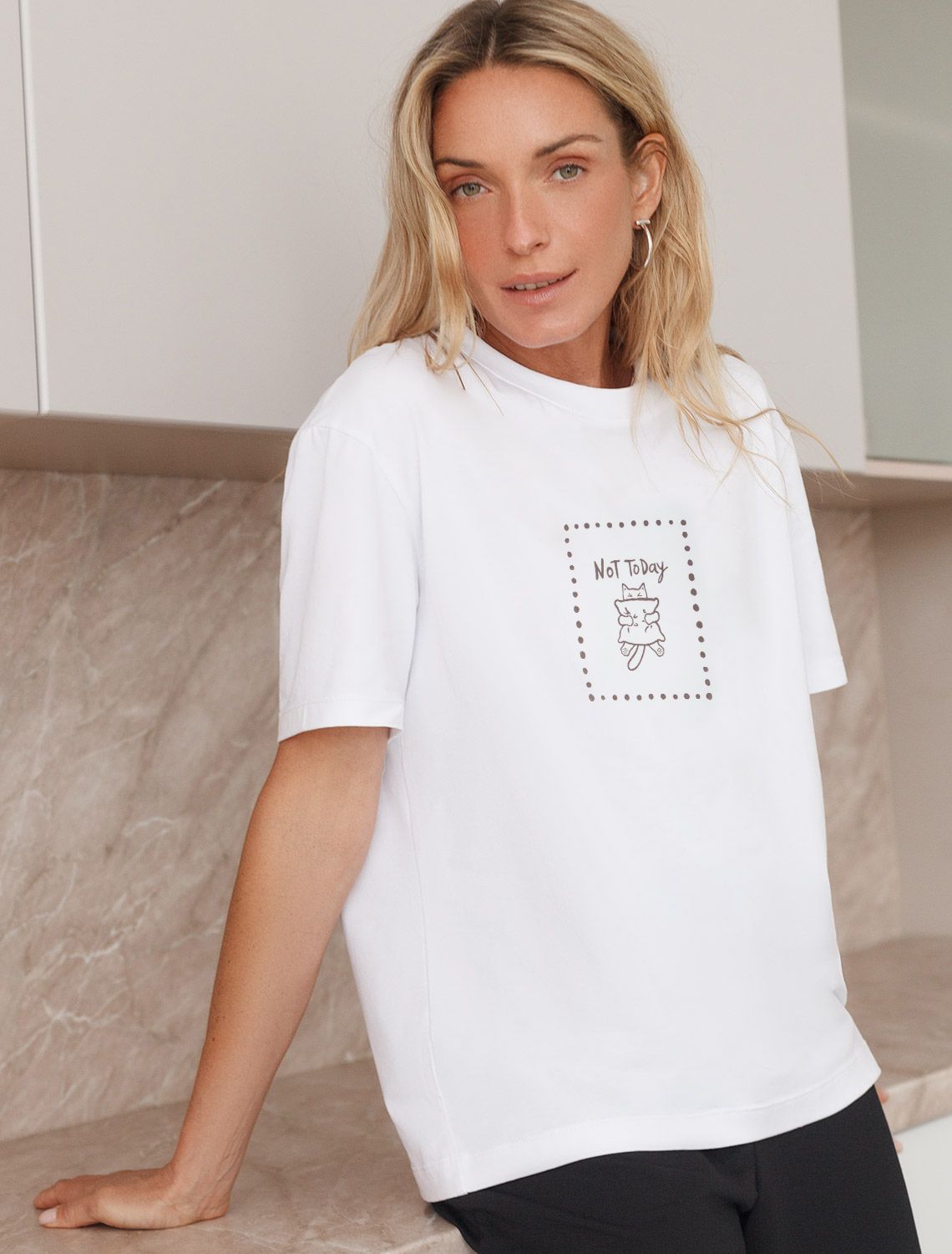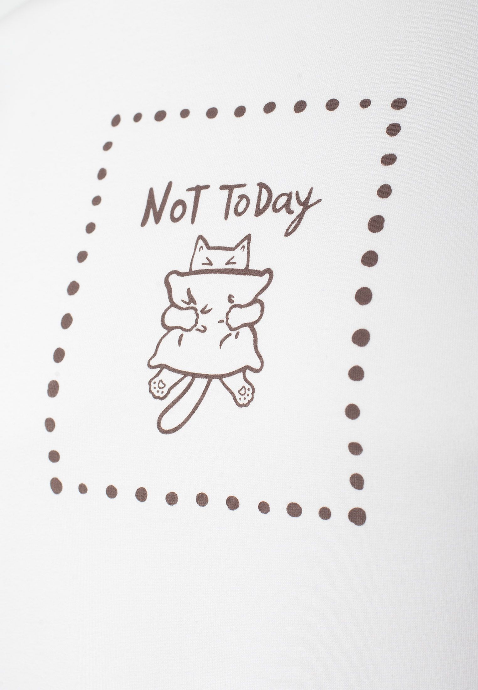 Особое внимание привлекает стильный принт в виде милого котика с минималистичной надписью. Перевод надписи Not today - Не сегодня. Принт выполнен красками с устойчивым покрытием, который добавляет изделию оригинальности и позволяет выразить индивидуальность.