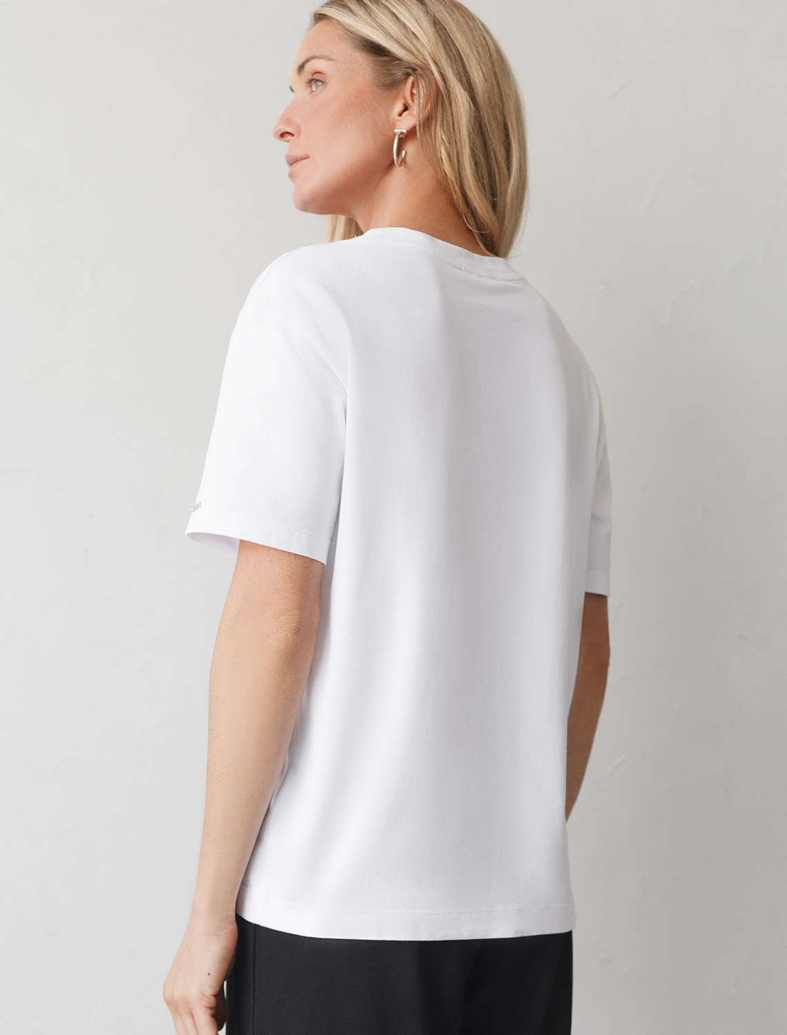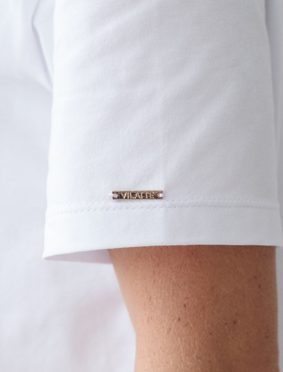 Футболка белого цвета изготовлена из премиального хлопка с эластаном, она обеспечивает невероятное ощущение уюта и легкости. Натуральный материал сохраняет форму и цвет после множества стирок, обеспечивая долговечность изделия, а его высокая воздухопроницаемость создает ощущение свежести даже в течение долгого дня.