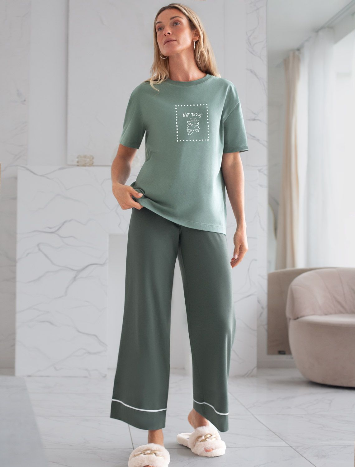 Особое внимание привлекает стильный принт в виде милого котика с минималистичной надписью. Перевод надписи Not today - Не сегодня. Принт выполнен красками с устойчивым покрытием, который добавляет изделию оригинальности и позволяет выразить индивидуальность.