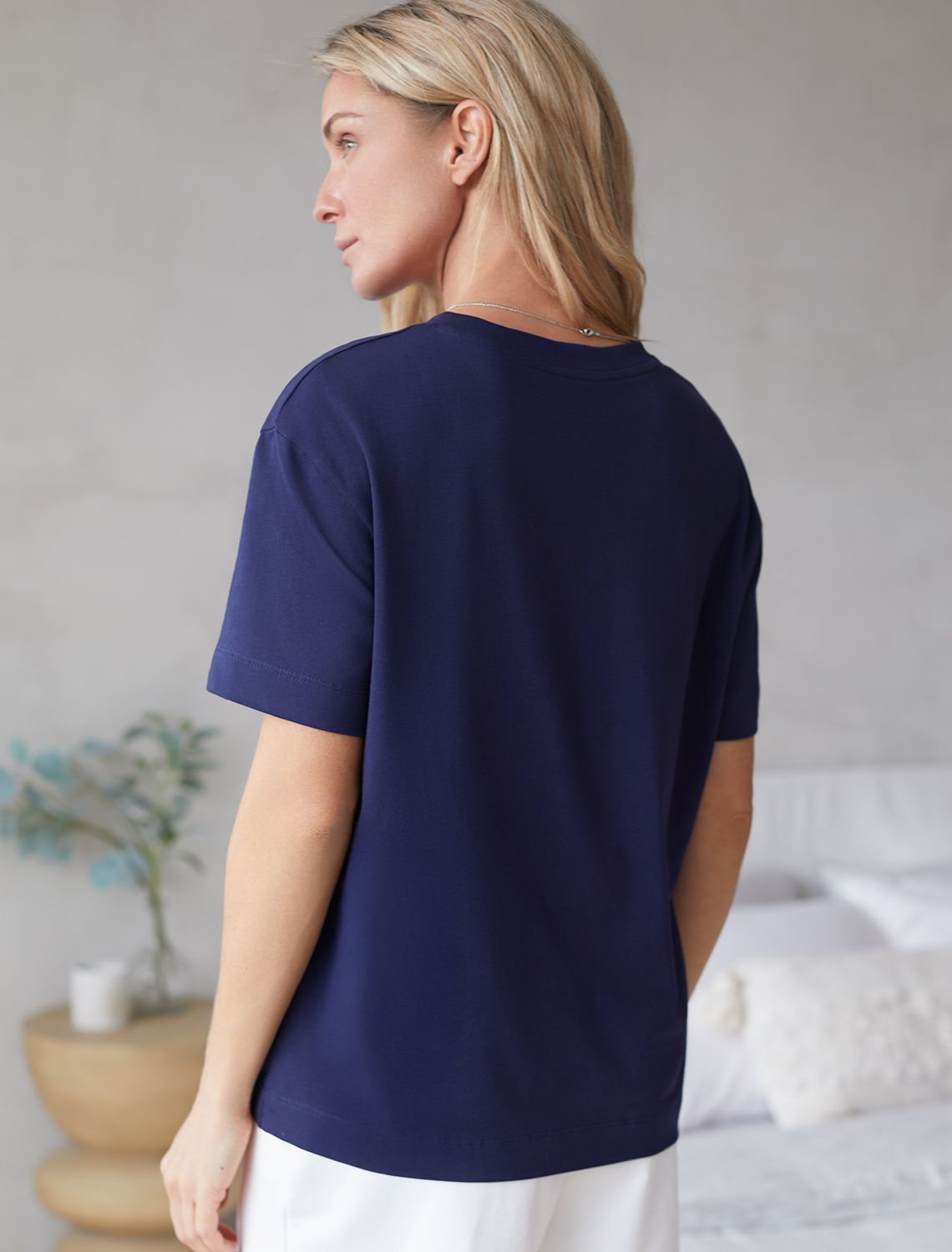 Футболка темно-синего цвета изготовлена из премиального хлопка с эластаном, она обеспечивает невероятное ощущение уюта и легкости. Натуральный материал сохраняет форму и цвет после множества стирок, обеспечивая долговечность изделия, а его высокая воздухопроницаемость создает ощущение свежести даже в течение долгого дня.