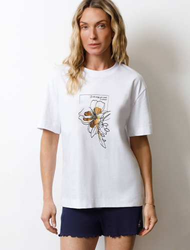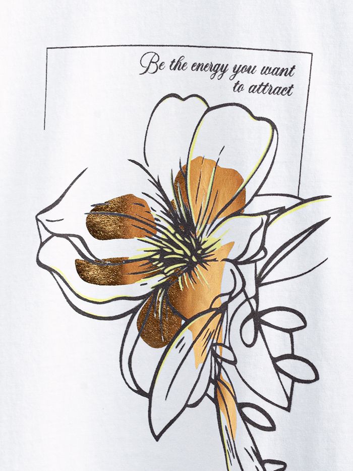 Футболка белого цвета выполнена из премиального 100% хлопка плотностью 140 Г/м2. Главная особенность этого изделия — тонкое кулирное полотно, которое легче и воздушнее стандартного варианта. Благодаря своей деликатной текстуре футболка идеально подходит для домашних образов и пижамных комплектов. Ткань отлично дышит, обеспечивая максимальный уют во время сна и отдыха. Особое внимание привлекает стильный принт контрастного цвета в виде цветка с надписью. Перевод надписи: Be the energy you vant to attract - Будь той энергией, которую хочешь привлечь. Принт выполнен красками с устойчивым покрытием, который добавляет изделию оригинальности и позволяет выразить индивидуальность. Свободный крой футболки дарит удобство и не стесняет движений, что делает ее идеальной для повседневной носки или активного отдыха, подчеркивает современный взгляд на моду. Подойдет девушкам и женщинам на любую фигуру, вы будете чувствовать себя в ней уверенно и комфортно. Лаконичный современный принт делает изделие универсальным: можно создавать стильные образы для прогулок, встреч, занятий спортом и домашних дел. Базовая футболка подходит для любой ситуации и сочетается с разными элементами гардероба.