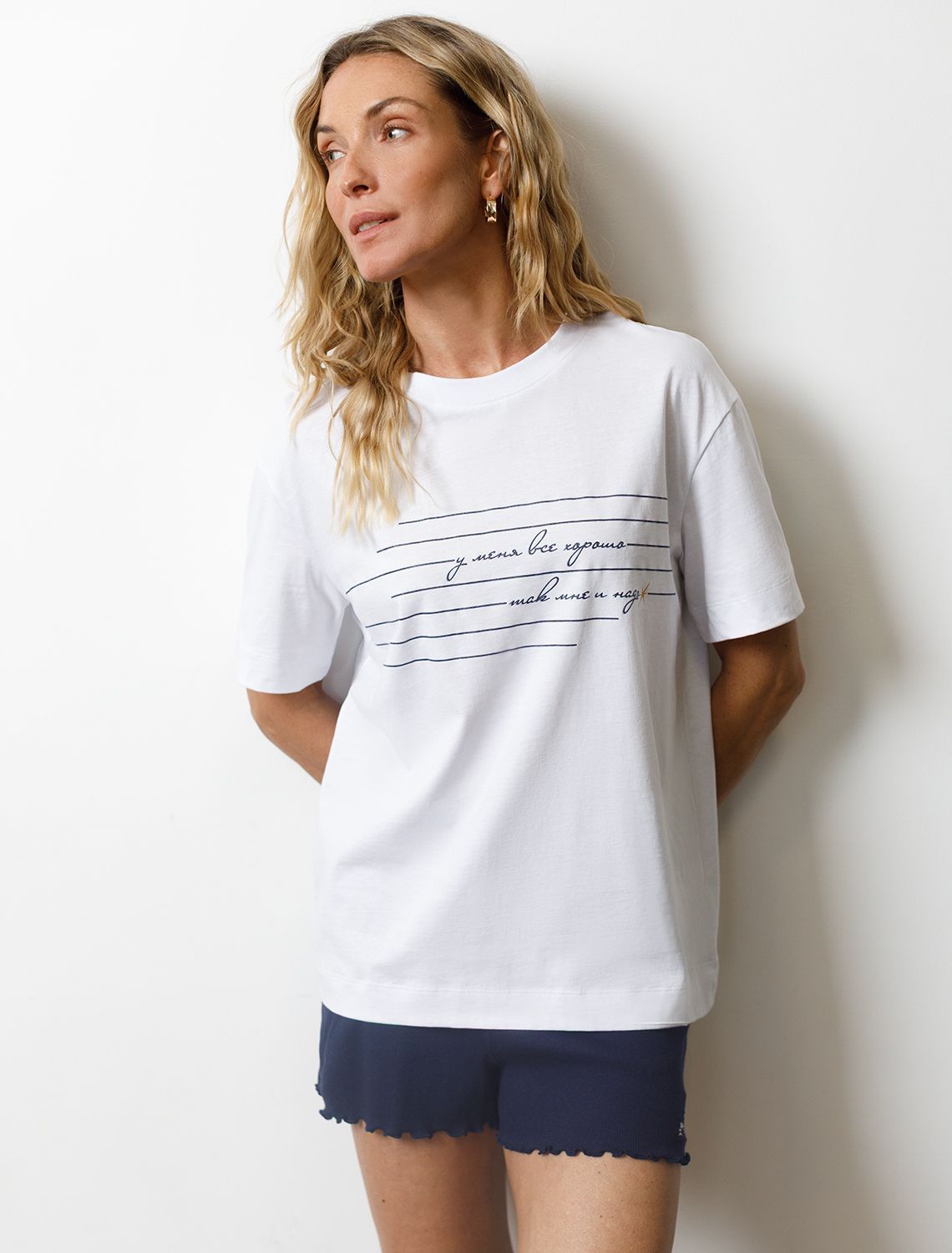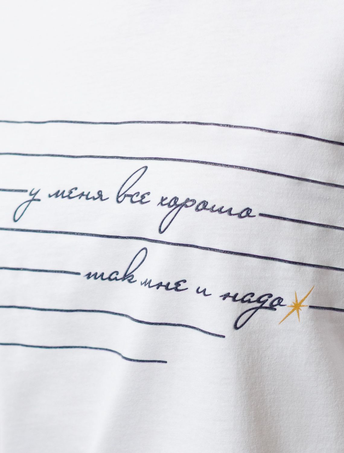 Футболка белого цвета выполнена из премиального 100% хлопка плотностью 140 Г/м2. Главная особенность этого изделия — тонкое кулирное полотно, которое легче и воздушнее стандартного варианта. Благодаря своей деликатной текстуре футболка идеально подходит для домашних образов и пижамных комплектов. Ткань отлично дышит, обеспечивая максимальный уют во время сна и отдыха. Особое внимание привлекает стильный принт контрастного цвета в виде полосок с надписью: У меня все хорошо, так мне и надо. Принт выполнен красками с устойчивым покрытием, который добавляет изделию оригинальности и позволяет выразить индивидуальность. Свободный крой футболки дарит удобство и не стесняет движений, что делает ее идеальной для повседневной носки или активного отдыха, подчеркивает современный взгляд на моду. Подойдет девушкам и женщинам на любую фигуру, вы будете чувствовать себя в ней уверенно и комфортно. Лаконичный современный принт делает изделие универсальным: можно создавать стильные образы для прогулок, встреч, занятий спортом и домашних дел. Базовая футболка подходит для любой ситуации и сочетается с разными элементами гардероба.