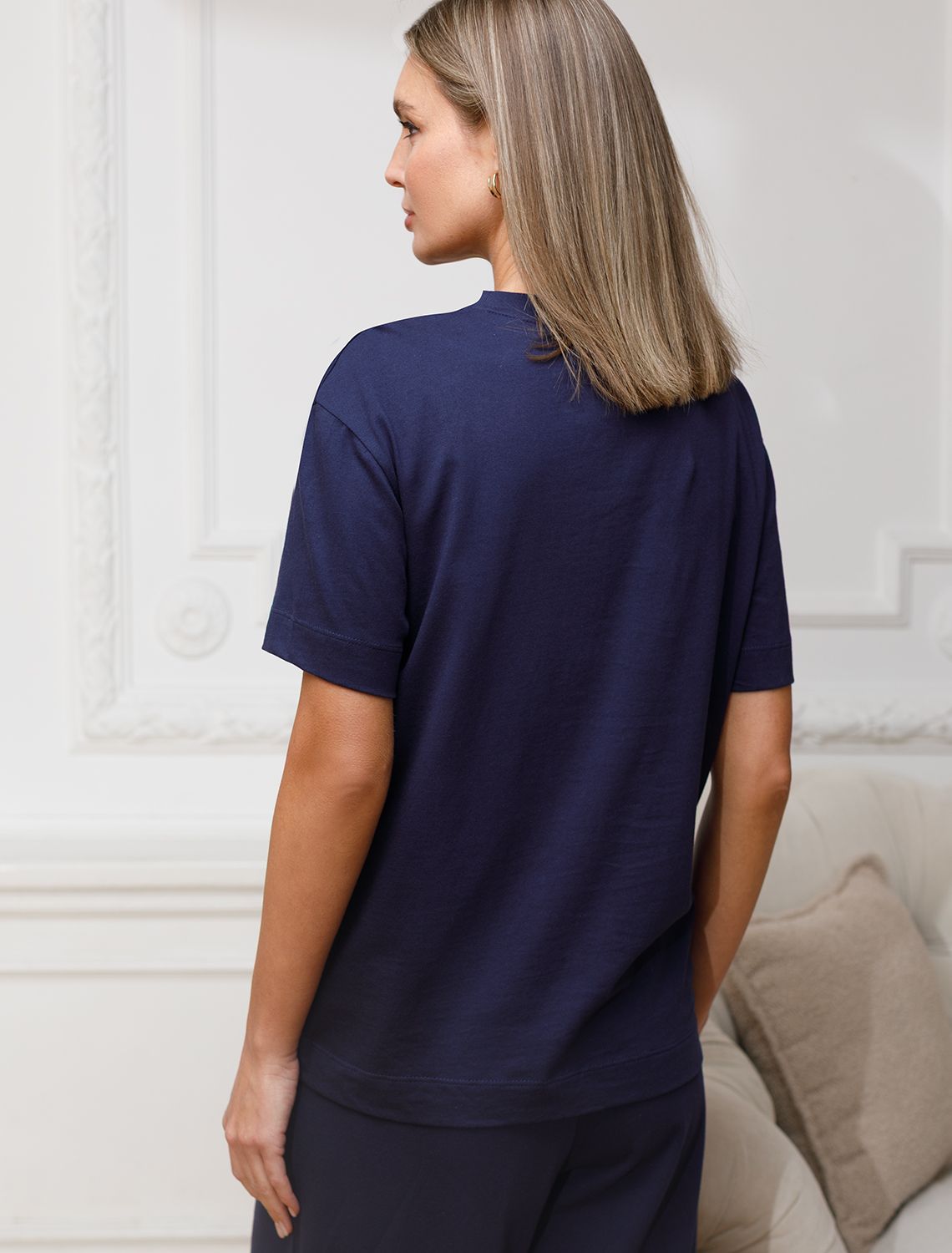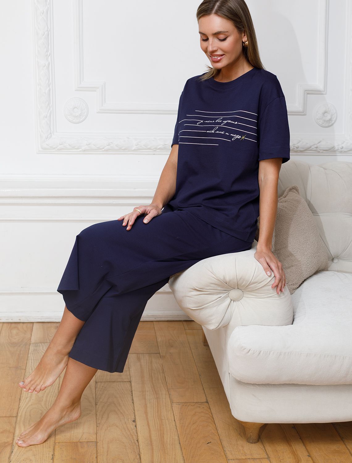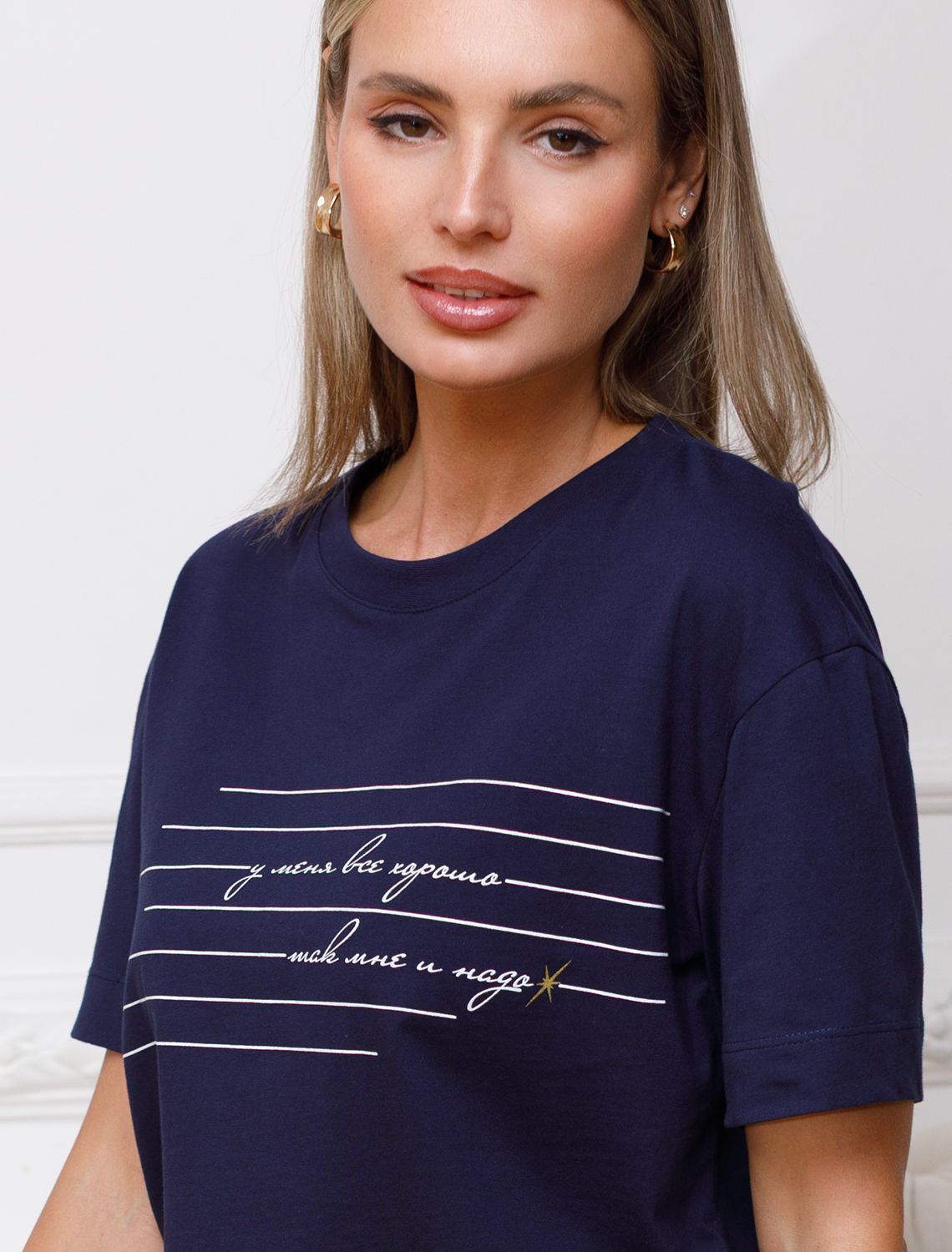 Футболка темно-синего цвета выполнена из премиального 100% хлопка плотностью 140 Г/м2. Главная особенность этого изделия — тонкое кулирное полотно, которое легче и воздушнее стандартного варианта. Благодаря своей деликатной текстуре футболка идеально подходит для домашних образов и пижамных комплектов. Ткань отлично дышит, обеспечивая максимальный уют во время сна и отдыха. Особое внимание привлекает стильный принт контрастного цвета в виде полосок с надписью: У меня все хорошо, так мне и надо. Принт выполнен красками с устойчивым покрытием, который добавляет изделию оригинальности и позволяет выразить индивидуальность. Свободный крой футболки дарит удобство и не стесняет движений, что делает ее идеальной для повседневной носки или активного отдыха, подчеркивает современный взгляд на моду. Подойдет девушкам и женщинам на любую фигуру, вы будете чувствовать себя в ней уверенно и комфортно. Лаконичный современный принт делает изделие универсальным: можно создавать стильные образы для прогулок, встреч, занятий спортом и домашних дел. Базовая футболка подходит для любой ситуации и сочетается с разными элементами гардероба.