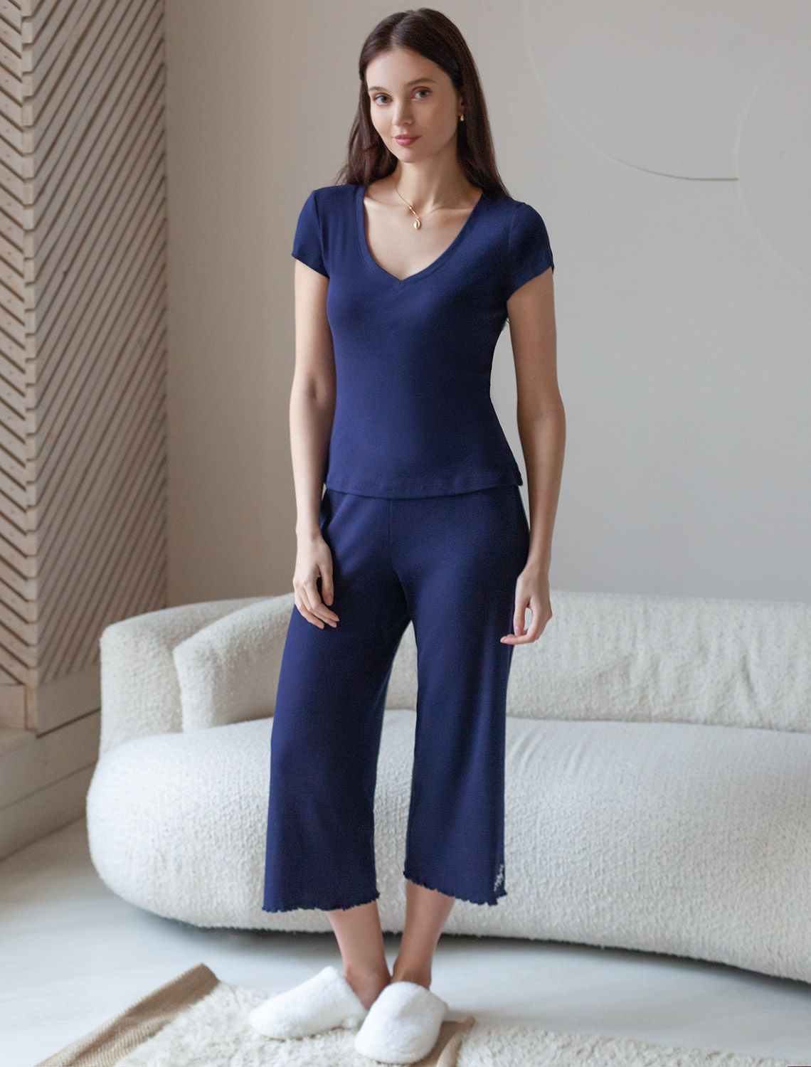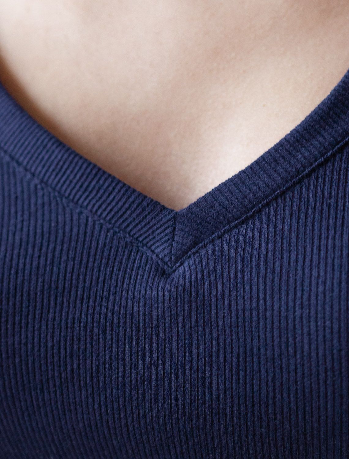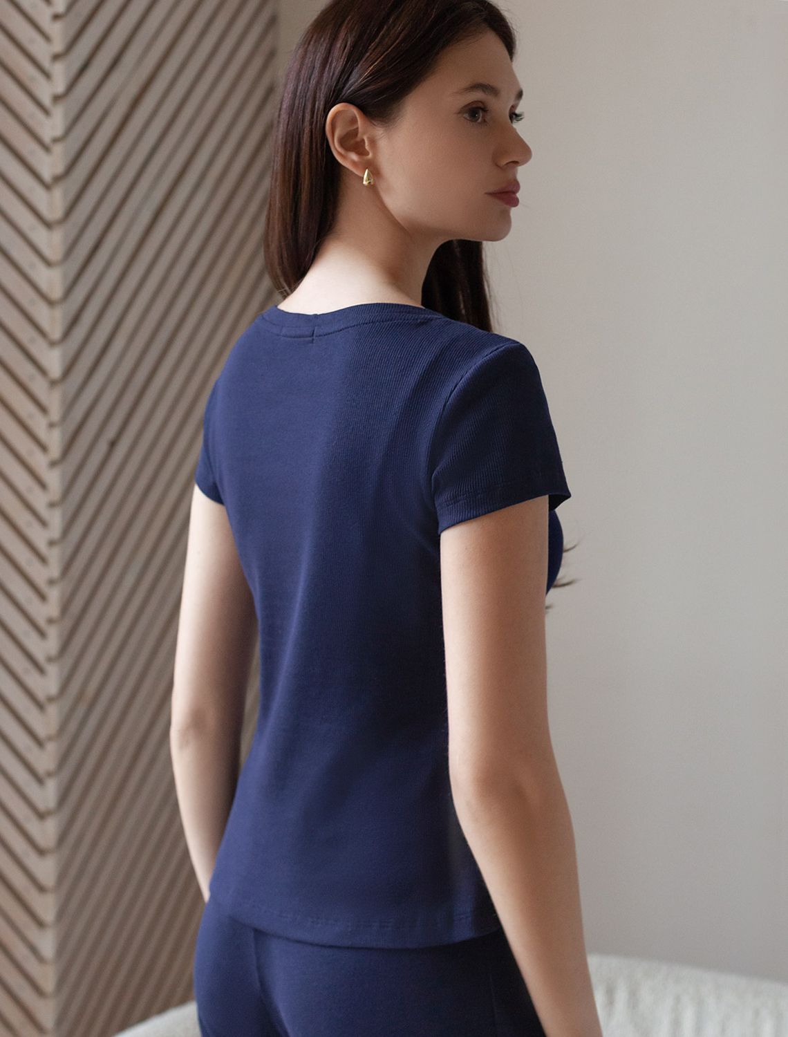 Футболка темно-синего цвета с V вырезом из фактурного трикотажа в рубчик. Особенность полотна - трикотаж кашкорсе удивительной мягкости, намного мягче стандартных вариантов, подходящий для расслабленных домашних и пижамных образов. Хлопок обеспечивает максимальный комфорт даже в течение длительного времени и позволяет коже дышать, а эластан в составе позволяет ткани подстраиваться под особенности фигуры. Короткие рукава делают модель легкой и универсальной. V-образный вырез красиво подчеркивает зону декольте, придавая образу утонченность и женственность, не открывая лишнего, сохраняя при этом комфорт и уверенность в себе. Футболка подойдет для девушек и женщин, которые ценят уют и удобство. Футболка в мелкий рубчик полуприлегающего кроя визуально вытягивает силуэт и делает фигуру более стройной. Разнообразие размеров позволяет выбрать подходящий вариант для любых параметров, в том числе на большие размеры. Эта красивая футболка практична и незаменима для тех, кто ищет качественные и стильные вещи на каждый день.