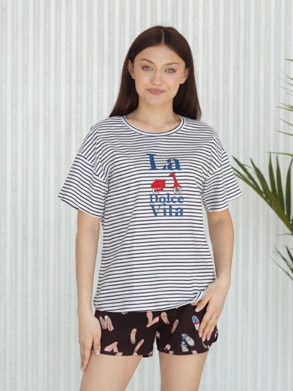 Оптовая продажа. Комплект женский домашний из хлопкового полотна. Футболка с короткими рукавами, приспущеной линией плеча, округлой горловиной, принт на полочке. Шорты укороченные, пояс на резинке, боковые карманы, принт по всему полотну изделия.