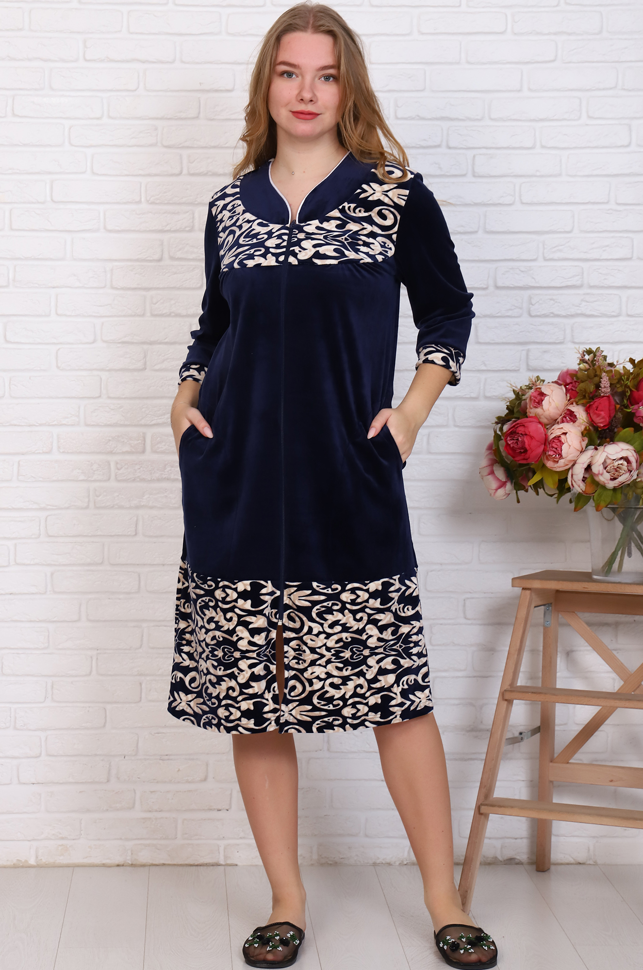 Мягкий, уютный велюровый халатик на молнии. Модель комфортной длины, прямого кроя, с изящным вырезом горловины, рукав 3/4 на манжете, удобные глубокие карманы.