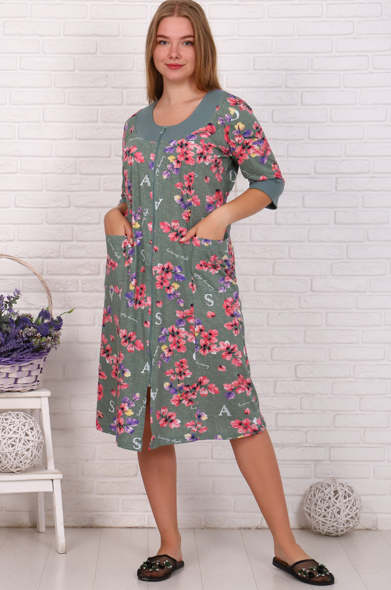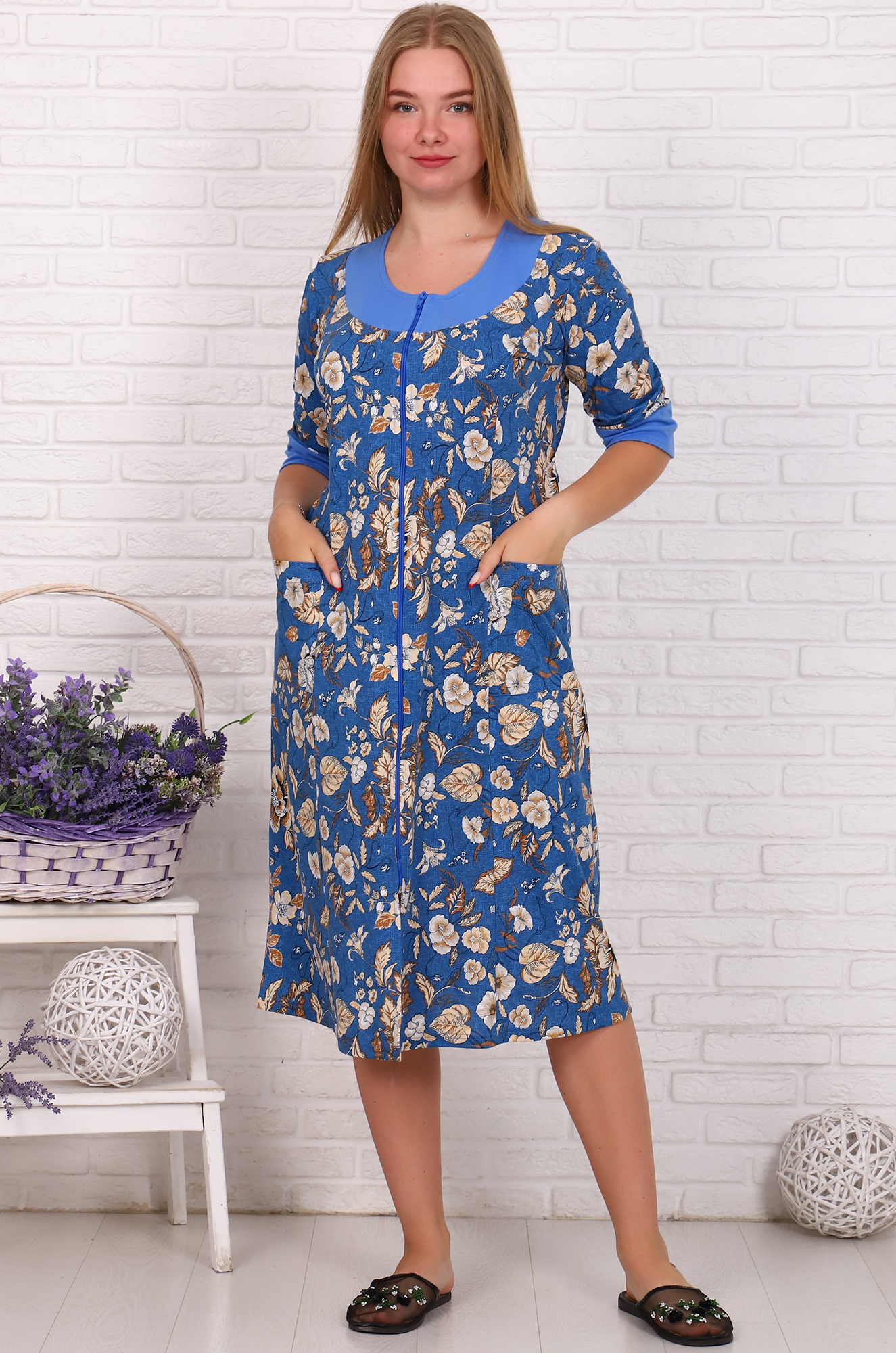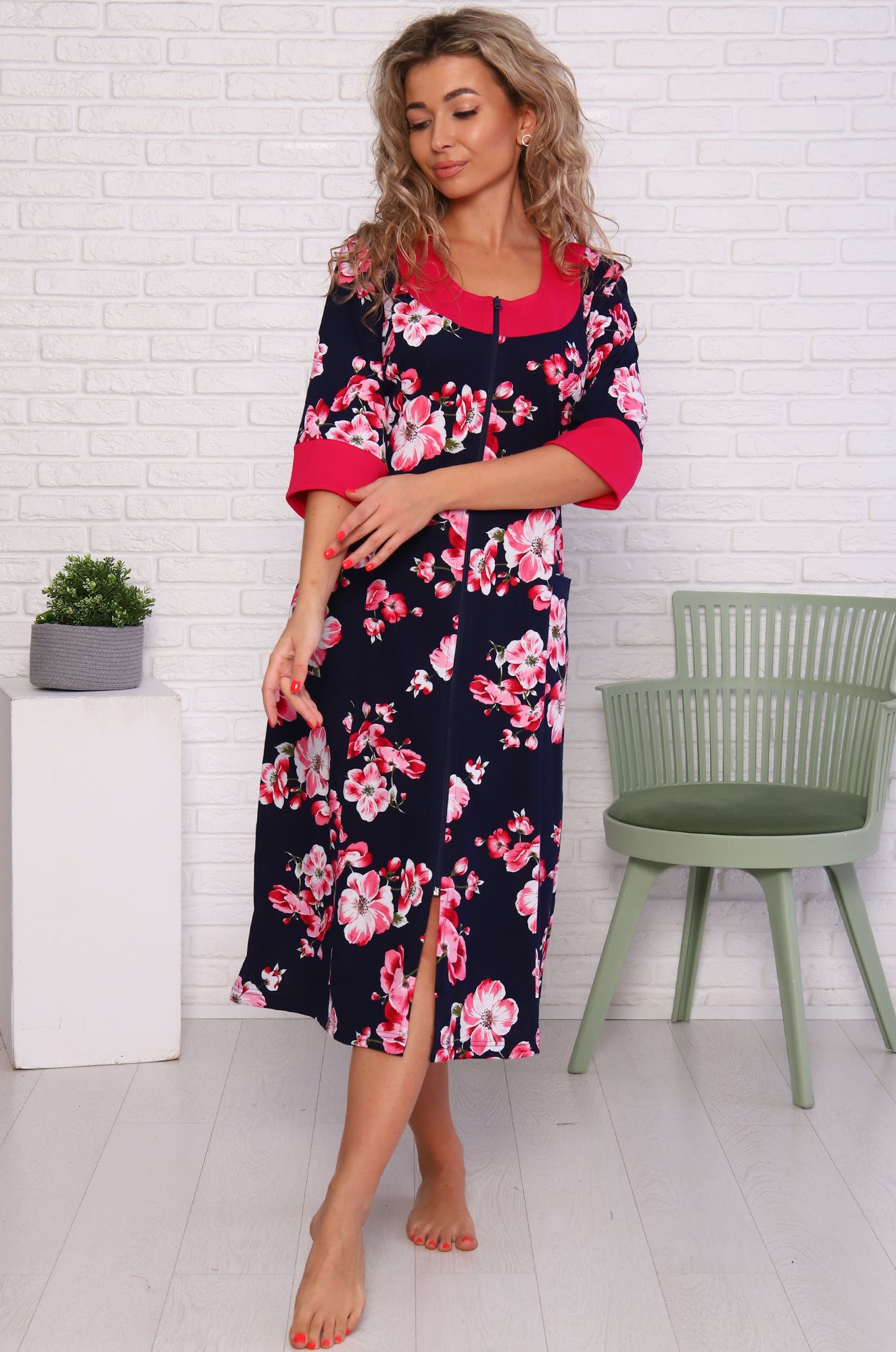 Хлопковый халат на молнии. Модель с глубокими рельефными вытачками и накладными карманами, удобный рукав 3/4, комфортная длина "миди", сзади поясок для моделирования фигуры.