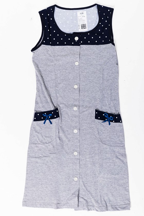 Молодёжный халат без рукавов выполнен из хлопковой ткани двух контрастных расцветок. Центральная застёжка на пуговицы, кокетка и планки на карманах из отделочного полотна. Карманы украшены декоративными бантиками.