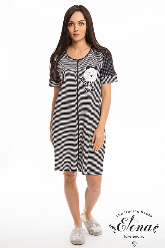 Халат с коротким рукавом и центральной застежкой на молнию. Халат выполнен из кулирки с комбинацией из двух набивок. В боковых швах расположены карманы, спереди нанесён оригинальный принт.