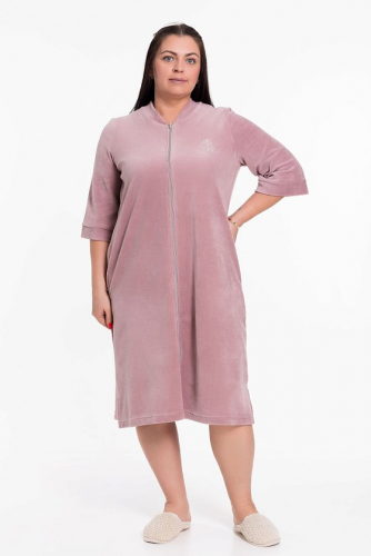 Халат на молнии выполнен из х/б полотна. Рукава короткие, на левой полочке нанесён принт. В боковых швах размещены карманы.