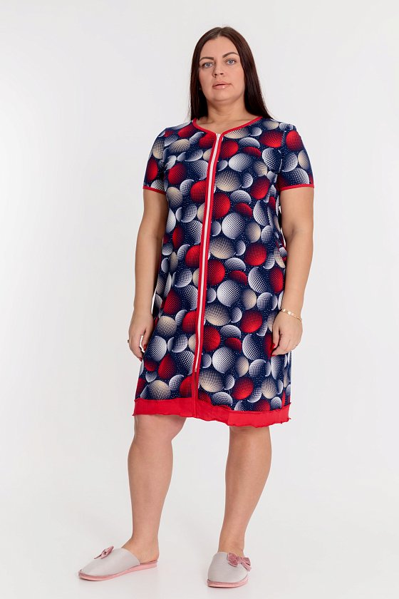 Халат свободного силуэта с застёжкой на молнию. Выполнен из х/б полотна. Короткие рукава, горловина и борта халата обработаны бейкой контрастного цвета. По бокам расположены карманы.