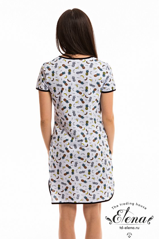 Халат из кулирки с набивным рисунком. С коротким рукавом, карманами по бокам и застежкой на молнию. Халат с закруглением по боковым швам, отделка контрастной бейкой.