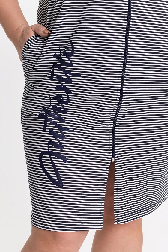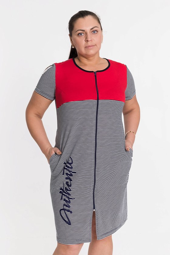Халат с застёжкой на молнию выполнен из кулирки, 100% хлопок. С правой стороны нанесён принт. Вырез горловины обработан бейкой, в боковых швах расположены карманы.