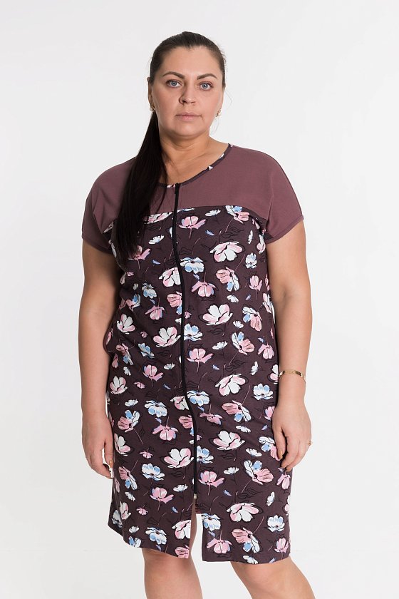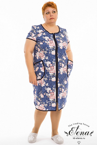 Халат для женщин выполнен из хлопкового полотна двух цветов-компаньонов. Линия плеча спущена, горловина и вход в карманы обработаны бейкой, застежка на молнию.