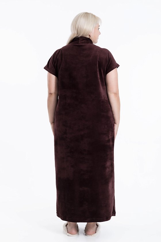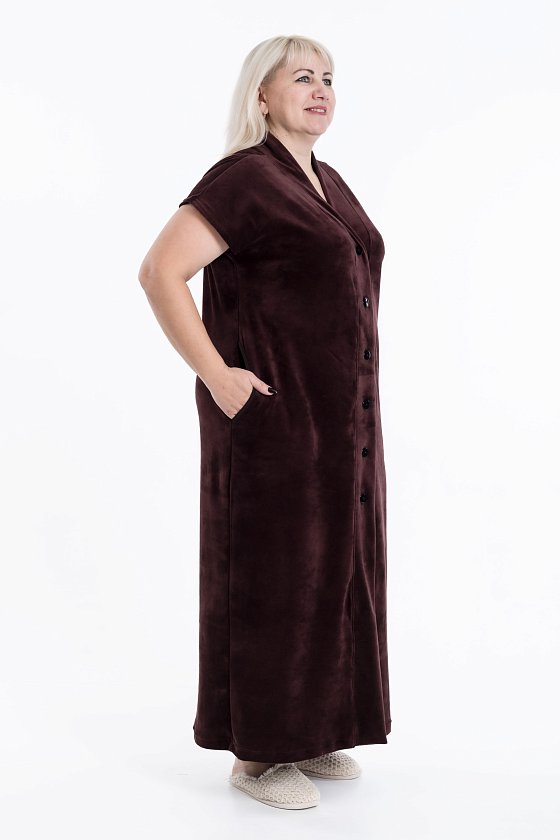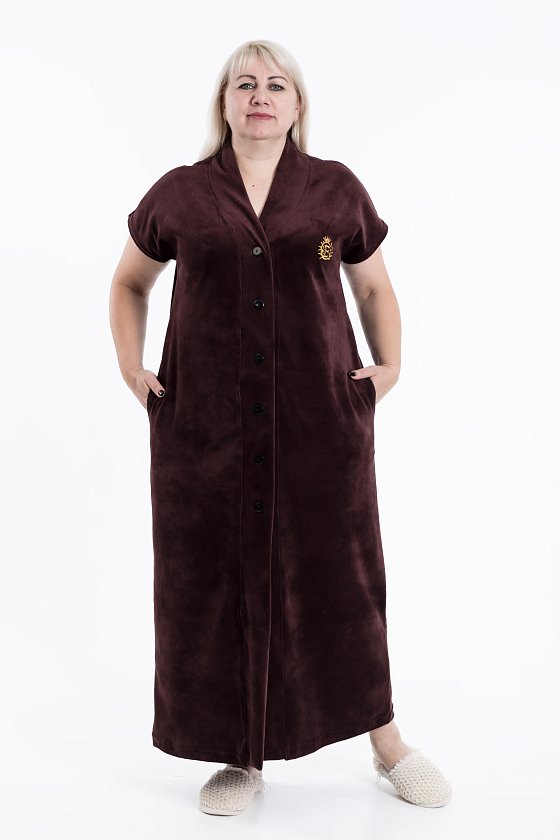 Женский халат — отличный выбор для домашнего отдыха. Халат выполнен из мягкого и приятного на ощупь однотонного велюра, который обеспечивает комфорт и тепло. Халат имеет свободный крой и застёгивается на пуговицы по всей длине. V-образный вырез горловины придаёт изделию стильный вид, с левой стороны расположена вышивка, которая добавляет изюминку в дизайн. Боковые карманы придают модели оригинальность. Такой халат станет отличным выбором одежды для дома.