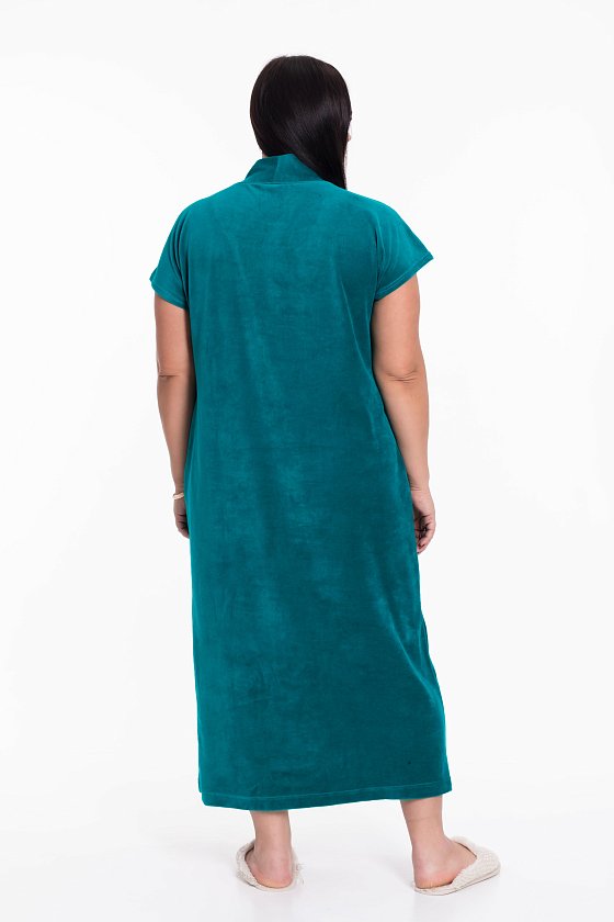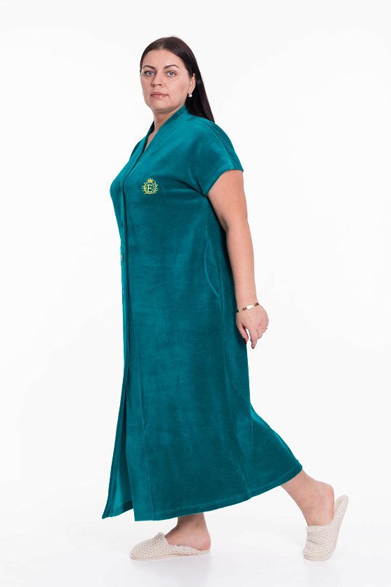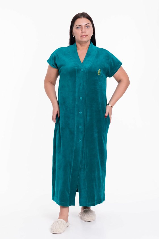 Женский халат — отличный выбор для домашнего отдыха. Халат выполнен из мягкого и приятного на ощупь однотонного велюра, который обеспечивает комфорт и тепло. Халат имеет свободный крой и застёгивается на пуговицы по всей длине. V-образный вырез горловины придаёт изделию стильный вид, с левой стороны расположена вышивка, которая добавляет изюминку в дизайн. Боковые карманы придают модели оригинальность. Такой халат станет отличным выбором одежды для дома.