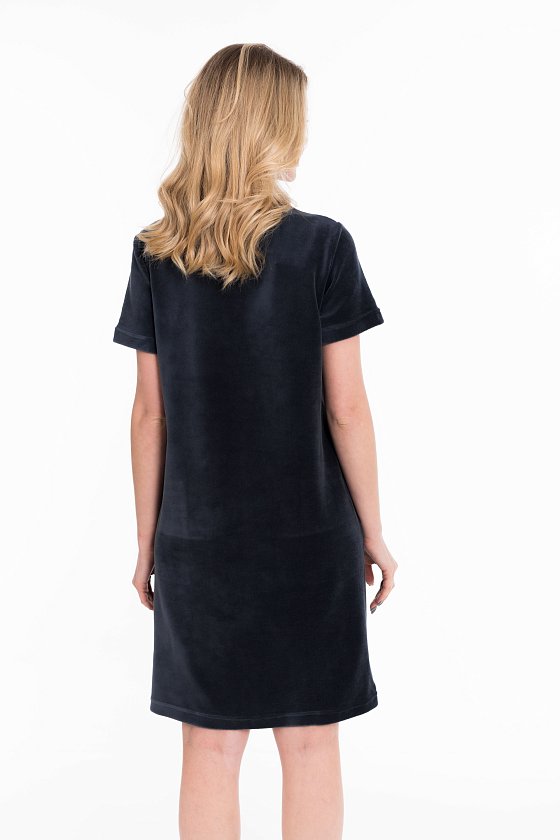 Халат имеет прямой крой и застёгивается на замок. V-образный вырез горловины придаёт изделию стильный вид. Короткий рукав обеспечивает свободу движений.