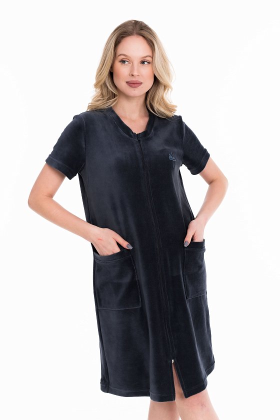 Женский халат — отличный выбор для домашнего отдыха. Он выполнен из мягкого и приятного на ощупь однотонного велюра серого цвета, который обеспечивает комфорт и тепло.