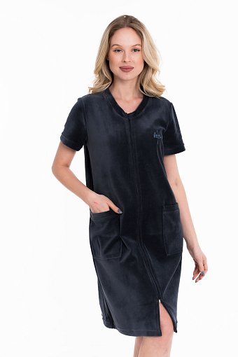 Халат имеет прямой крой и застёгивается на замок. V-образный вырез горловины придаёт изделию стильный вид. Короткий рукав обеспечивает свободу движений.