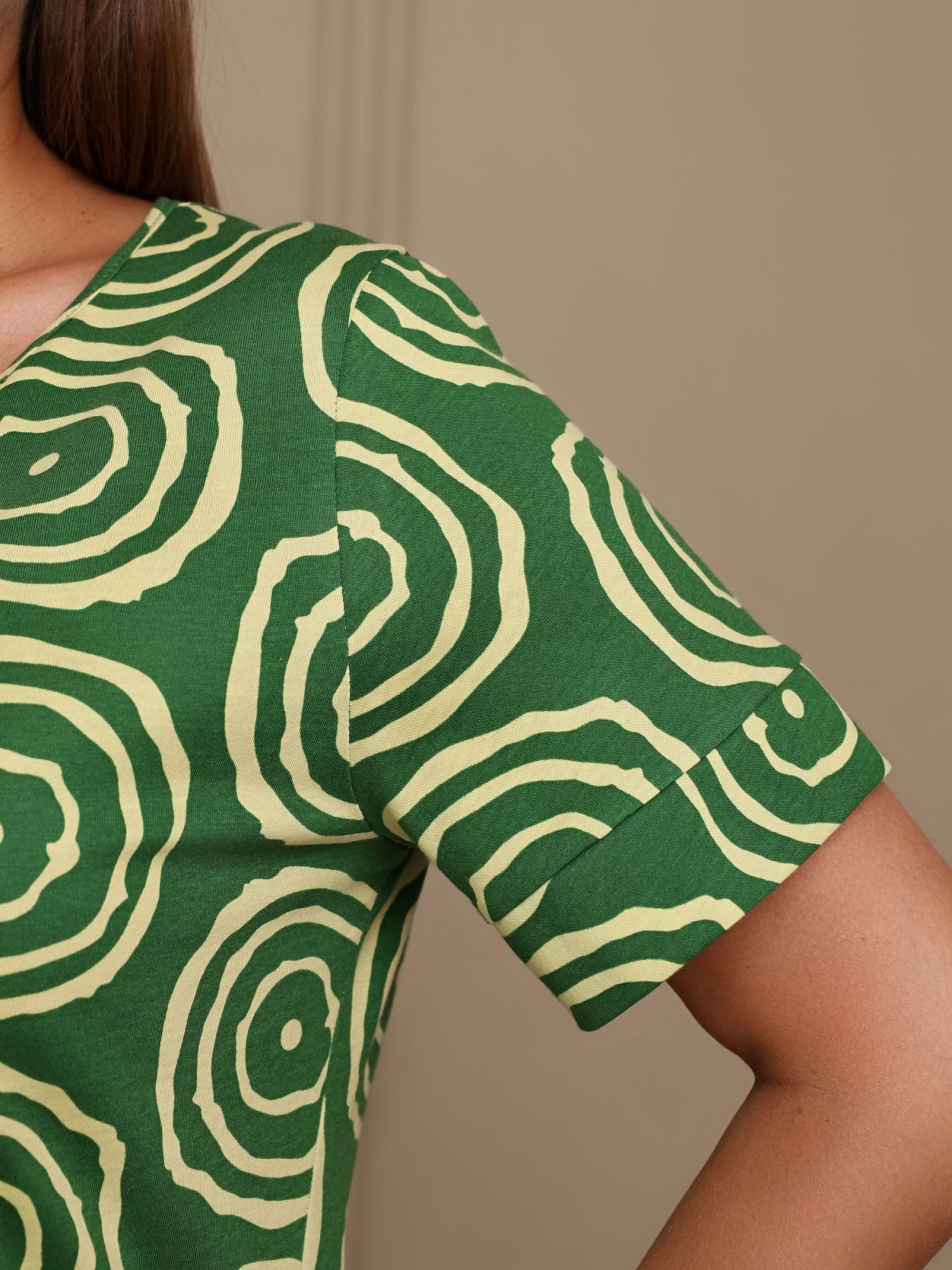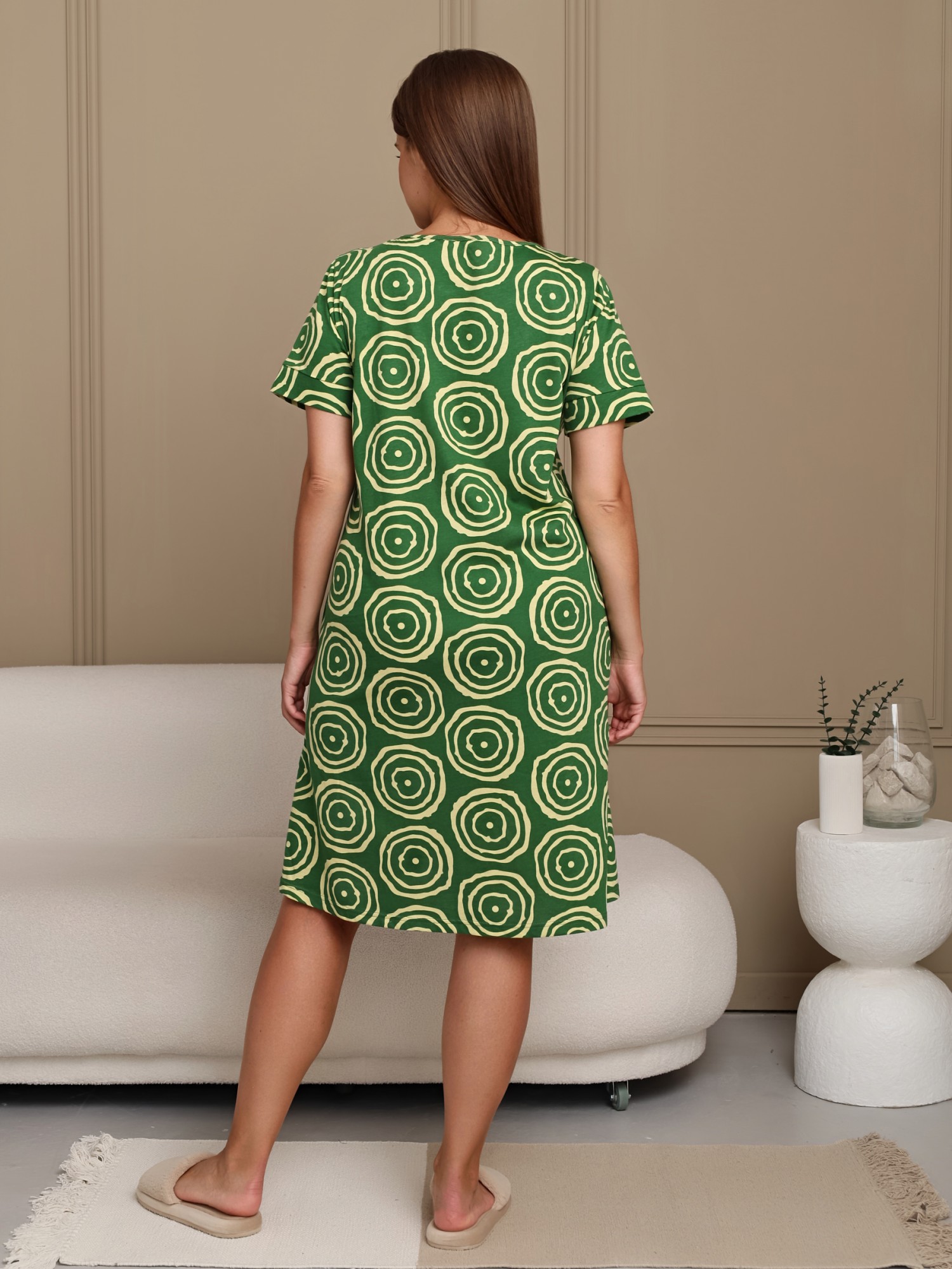 Халат женский из трикотажного полотна «кулирка» с набивным рисунком полуприлегающего силуэта, с горловиной овальной формы, окантованной основным материалом, короткими втачными рукавами с притачными манжетами. В боковых швах, смещенных в сторону полочки, обработаны карманы.