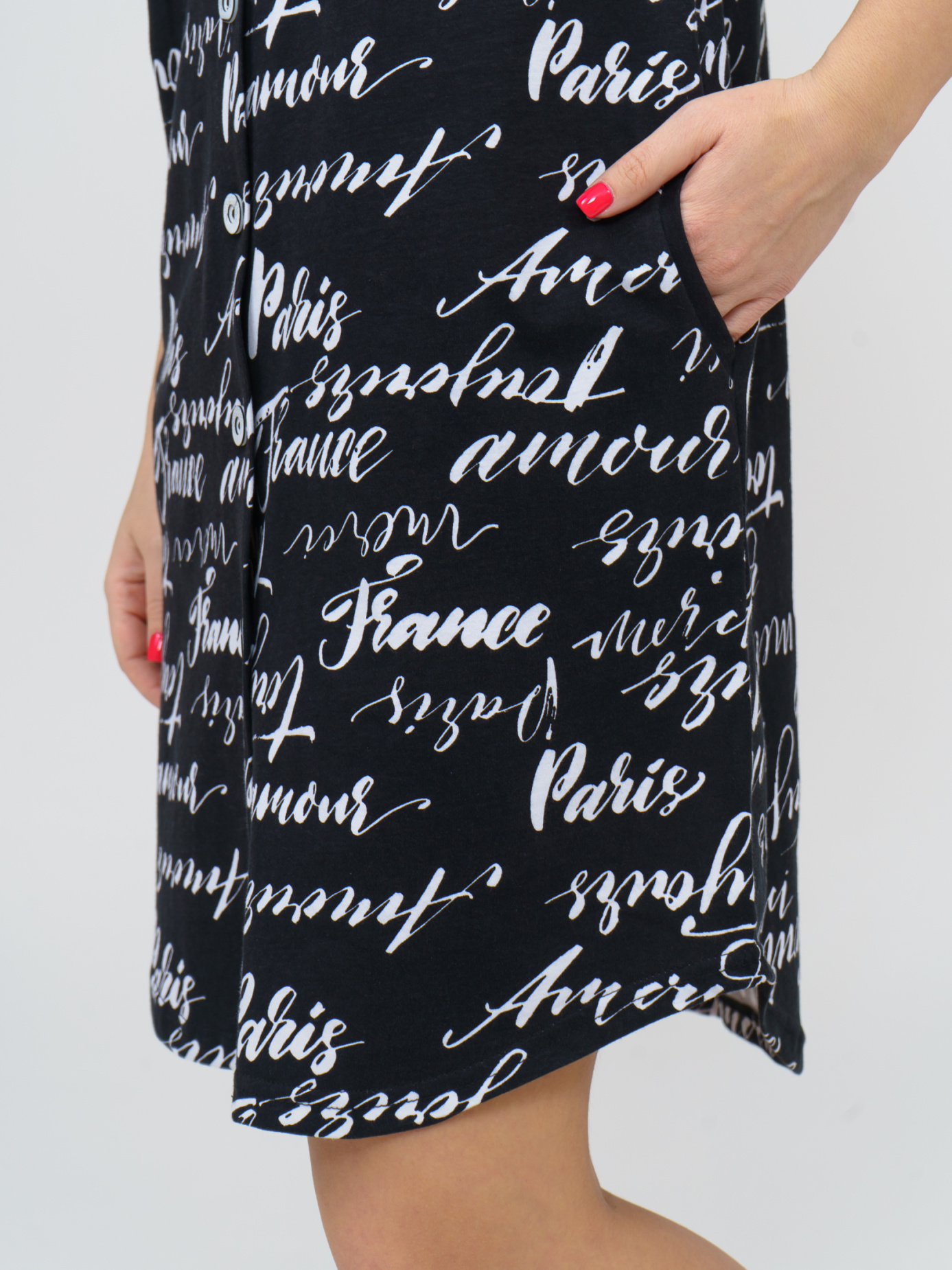 Лёгкий халатик из хлопка в рубашечном стиле. Втачной рукав 3/4 с отворотом, отложной воротник, застёжка на пуговицы, карманы в боковых швах. Низ изделия имеет фигурные вырезы.