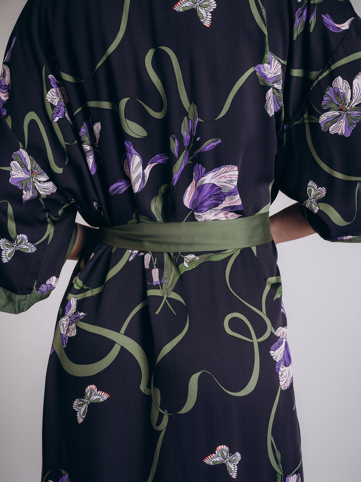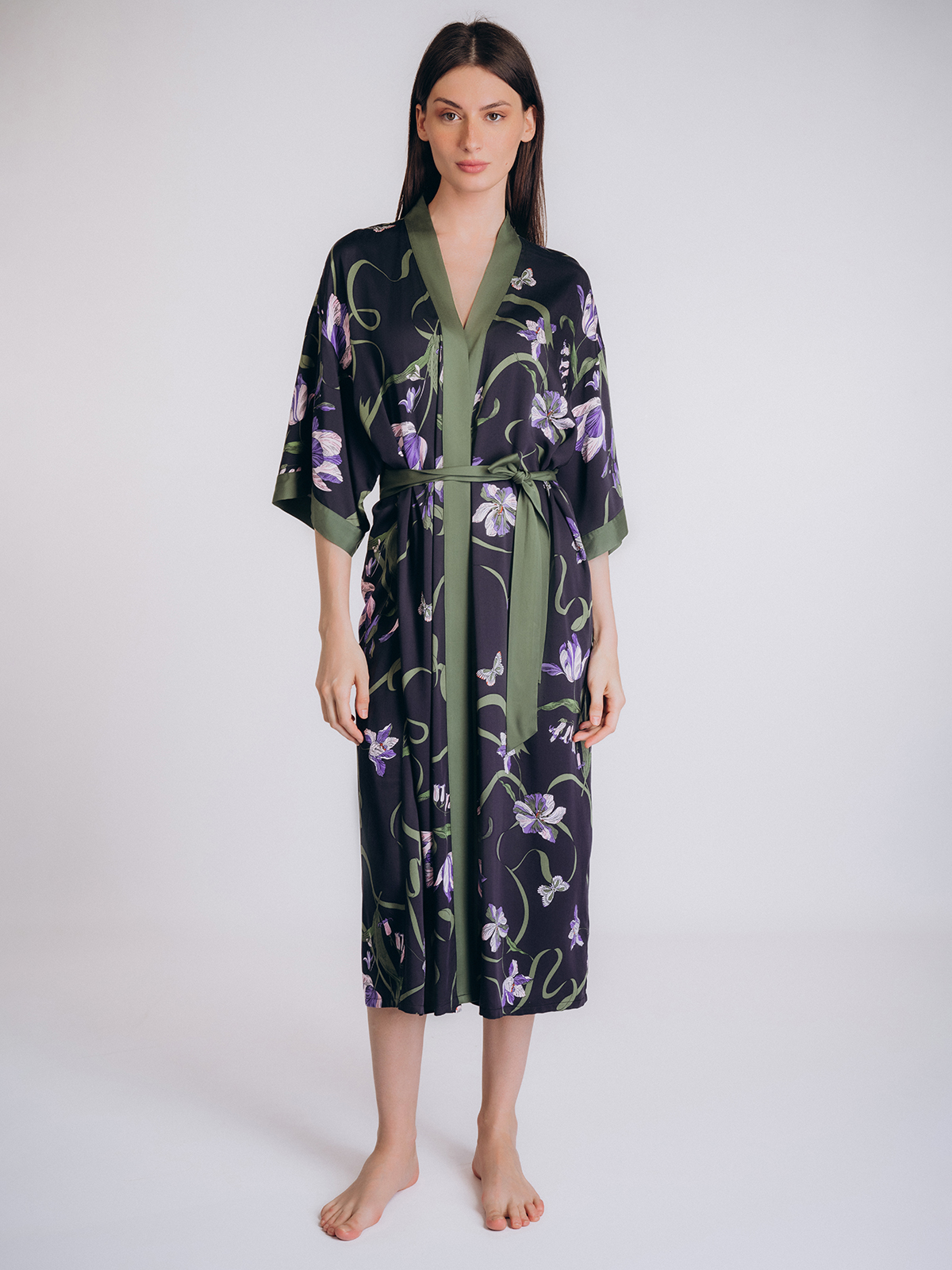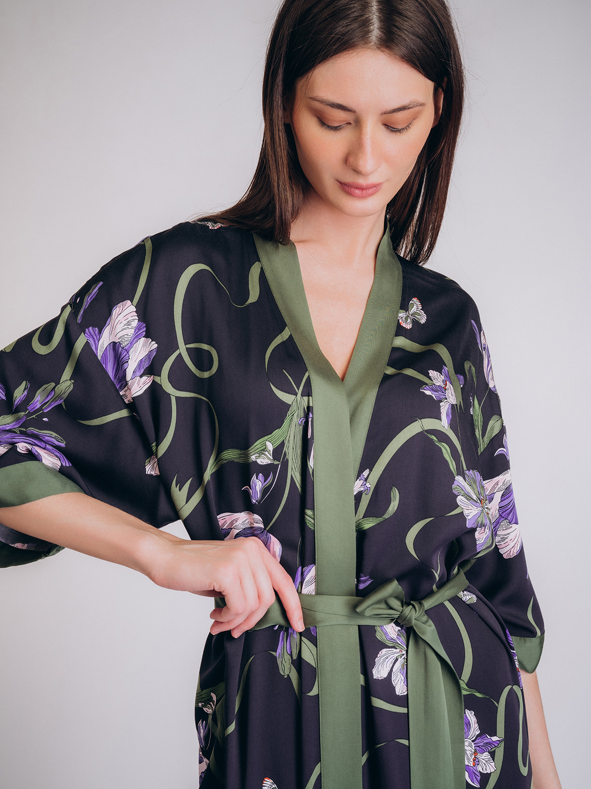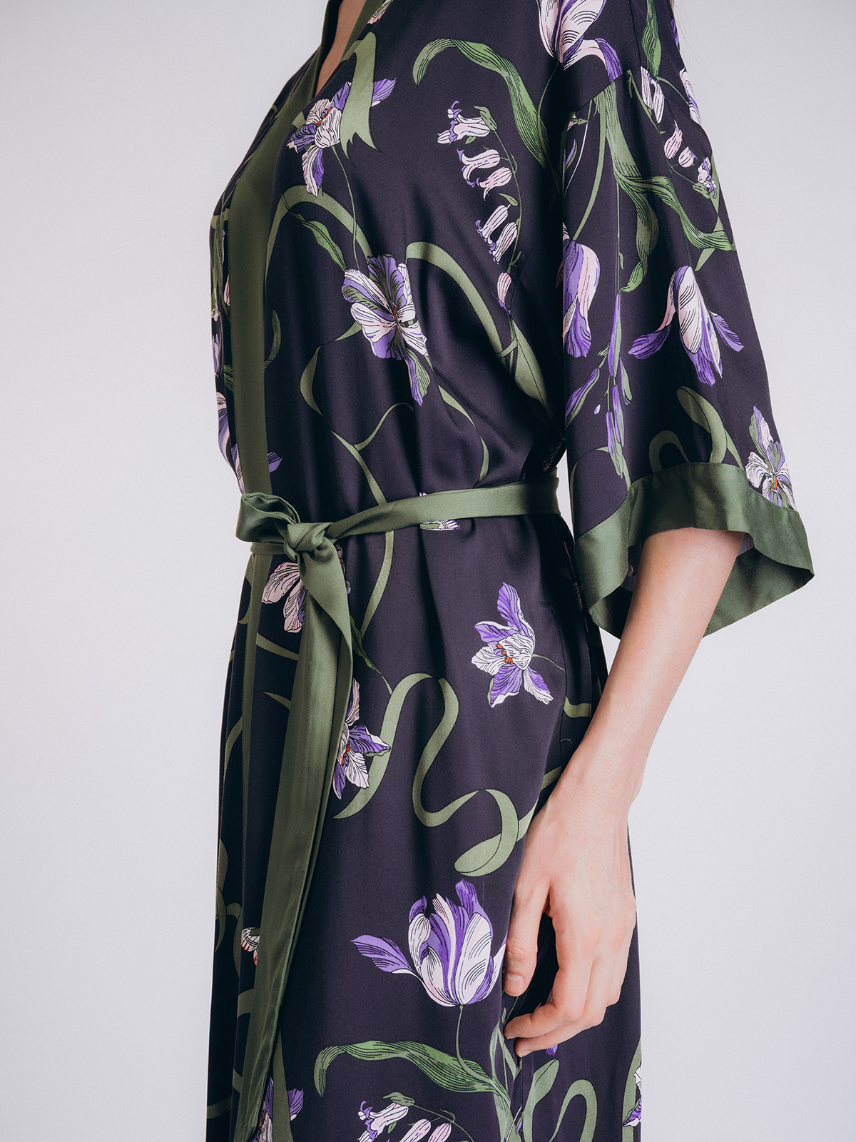 Халат имеет широкий рукав и пояс на талии для удобной фиксации.