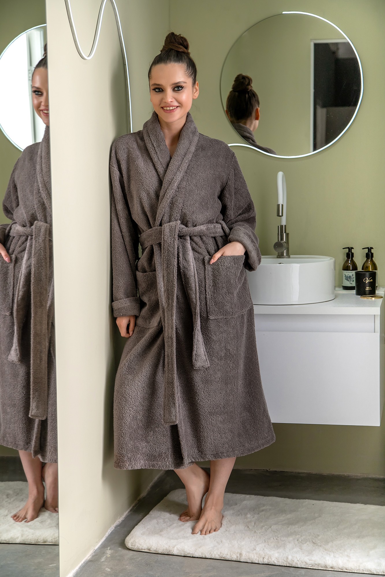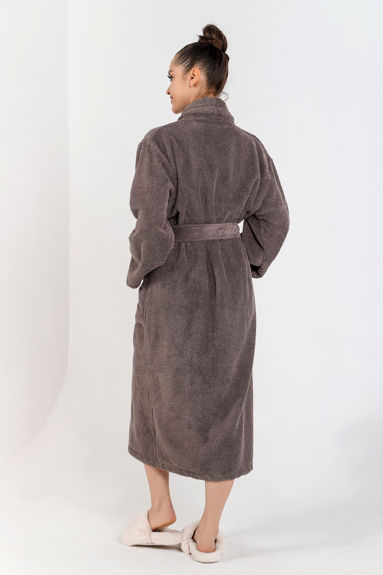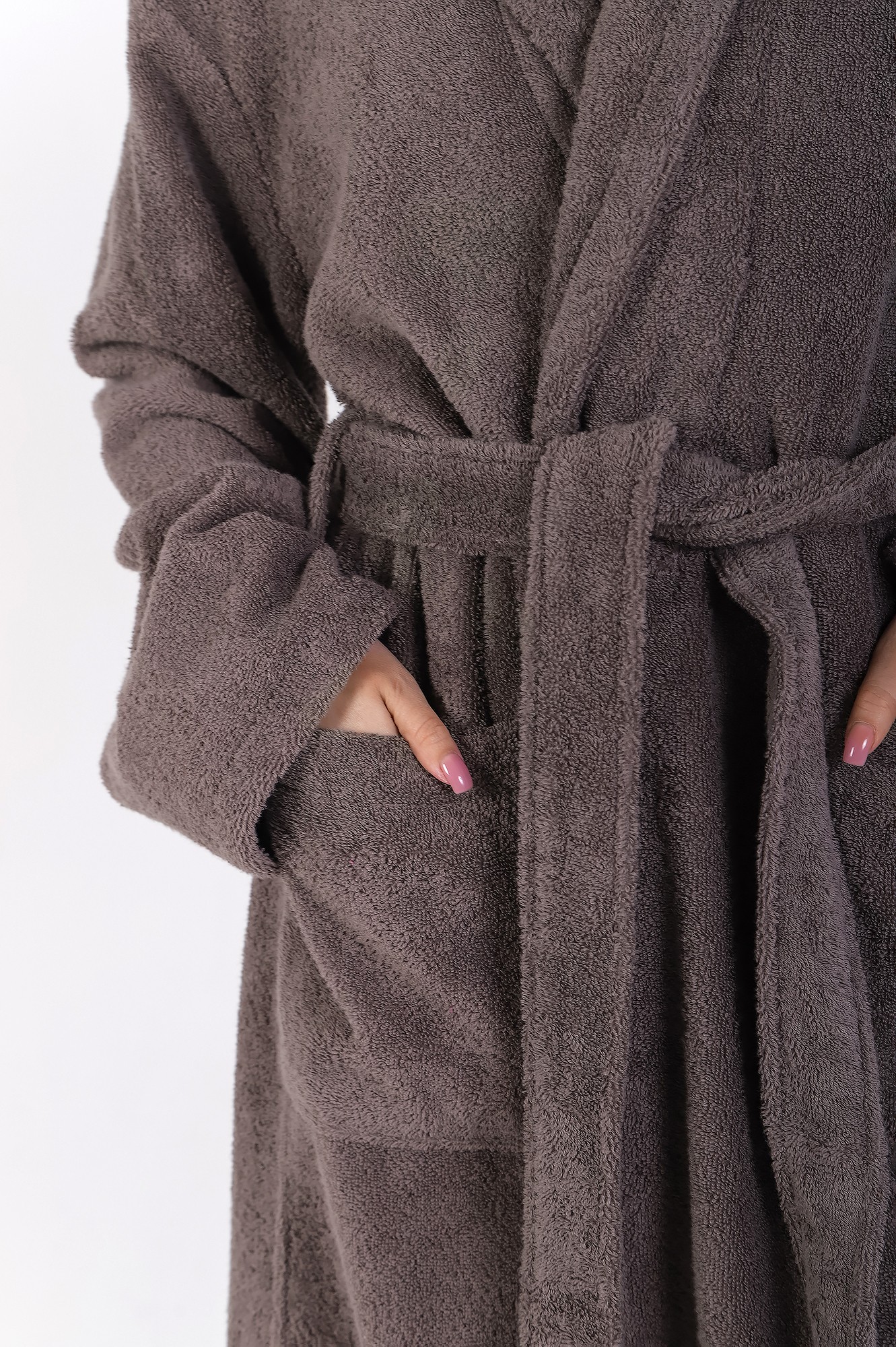 Женский халат из двустороннего махрового хлопкового полотна. Модель на запах, с поясом в шлёвках, с боковыми карманами, с воротником "шаль", с петлей-вешалкой по горловине спинки.