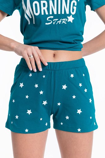 Комплект выполнен из кулирки, 100% хлопок, состоит из шорт и футболки с коротким втачным рукавом. Шорты с боковыми карманами и притачным поясом на резинке. Футболка с принтом спереди, круглый вырез горловины обработан бейкой.