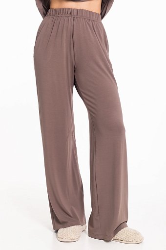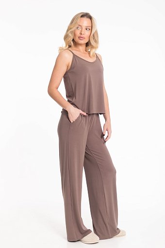 Пижама из мягкой однотонной вискозы состоит из топа на бретелях и брюк. Топ с регулируемыми по длине бретелями позволяет настроить посадку по фигуре. Брюки выполнены с удобным поясом на резинке и боковыми карманами, что обеспечивает комфорт при носке. Лёгкое вискозное полотно приятно к телу и идеально подходит для сна и домашнего отдыха.