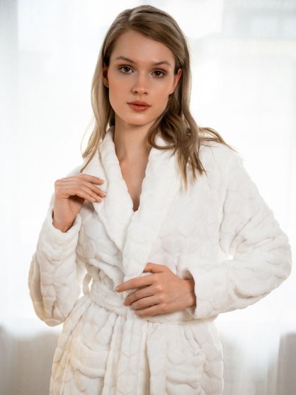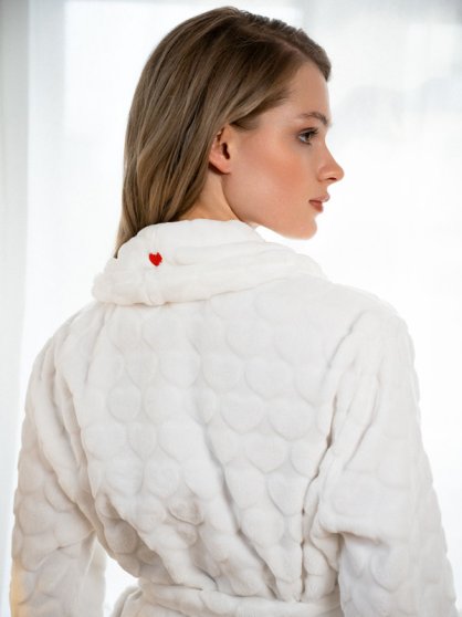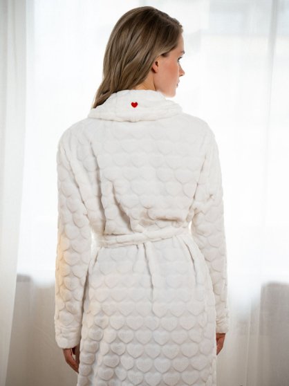 Оптовая продажа. Халат женский белого цвета из полиэстера, прямой, свободного кроя, с длинными рукавами, накладными карманами, выбитыми объемными сердечками, на запах, с регулирующим поясом.
