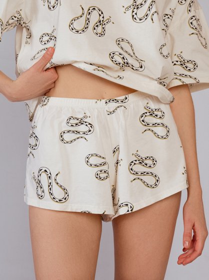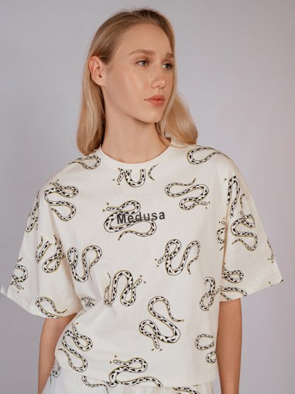 Оптовая продажа. Пижама женская молочного цвета с изображением змей и надписью “Medusa”, из высококачественного хлопка, состоящая из футболки и шорт. Футболка прямая, свободного кроя, короткими рукавами, округлым вырезом горловины. Шорты укороченные, свободные, пояс на мягкой эластичной резинке, обеспечивающий удобство и свободу движений во время носки, надежно фиксируясь на теле. Изделия из натурального хлопка подходят для чувствительной кожи, летнего и зимнего периода, длительное время не разрушаются под влиянием воды и света, они дышащие и легкие.
