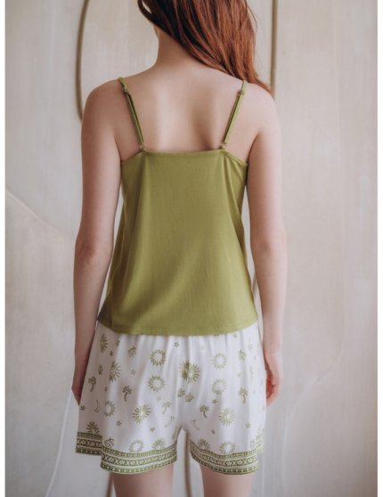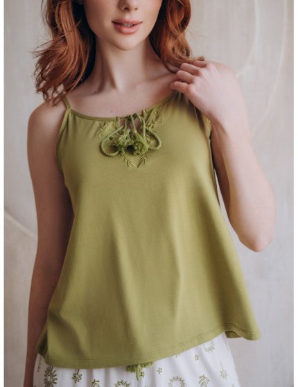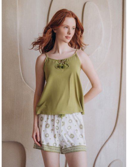 Оптовая продажа. Пижама женская из полотна, состоящего из бамбука и хлопка: Майка свободного силуэта на тонких регулируемых бретелях, однотонная в зелёном цвете, верхний вырез на передней части украшен цветочной вышивкой и двумя завязываемыми шнурками с кисточками. Шорты свободные на тонкой мягкой резинке с вязаным регулирующим шнурком с кисточками, с абстрактным принтом.