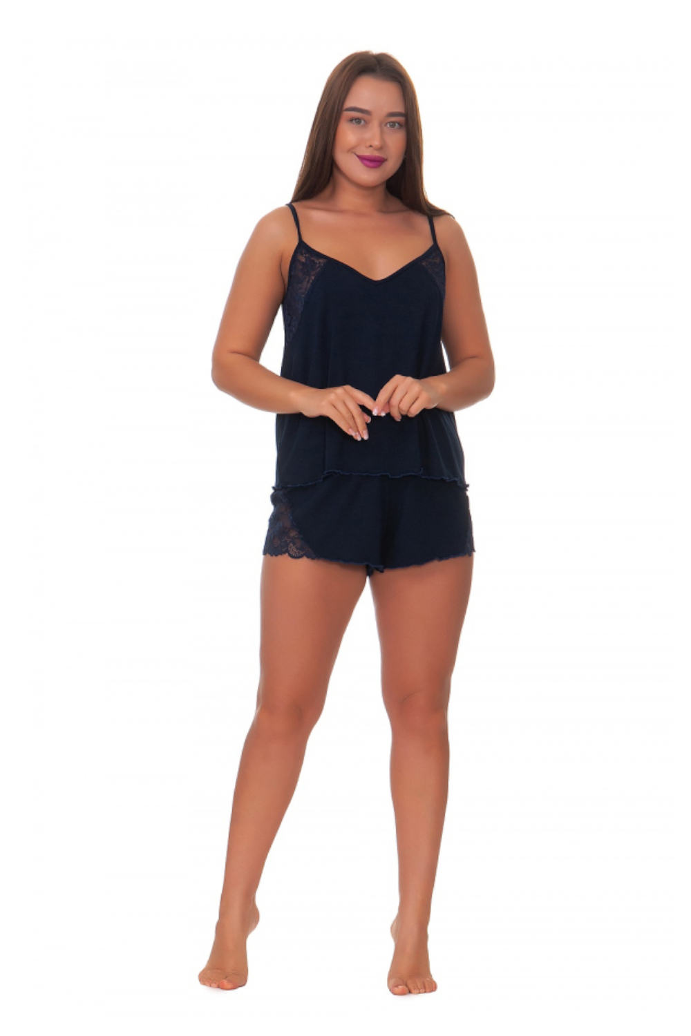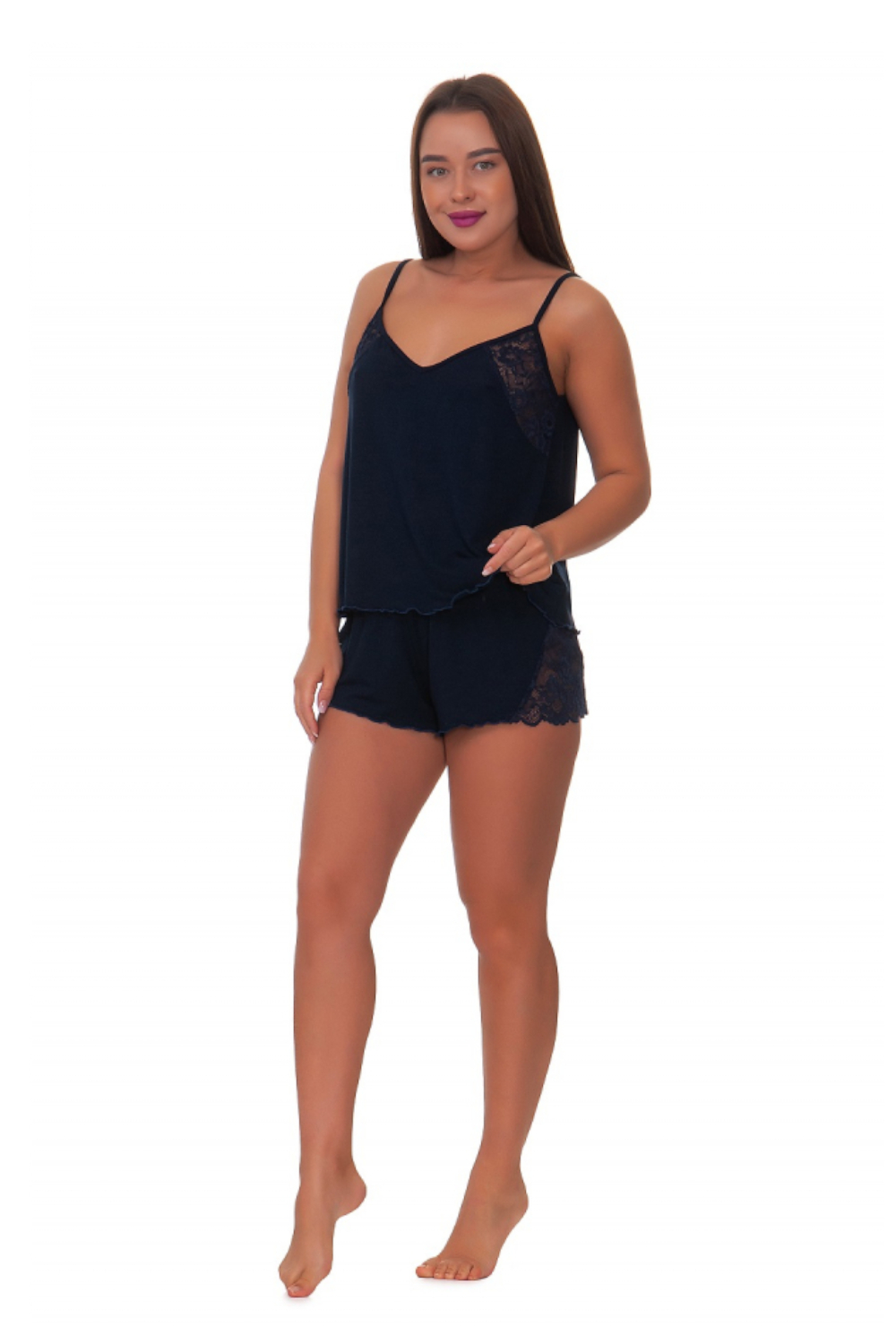 Пижама женская: топ на брительках и шорты с гипюровыми вставками. Цвет: белый;розовый;темно-синий; Материал: кулирка; Состав: 100% ХБ.