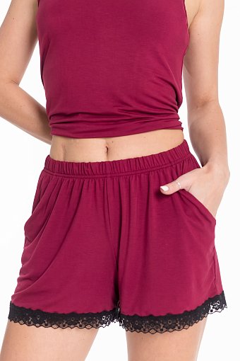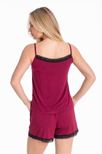 Пижама из мягкого вискозного полотна состоит из топа на бретелях и шорт с поясом на резинке. Модель украшена кружевной отделкой по верху топа и низу шорт, что придаёт ей нежность и изысканность. В шортах предусмотрены удобные боковые карманы.