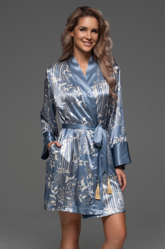 Комплект Mia-Amore состоит из топа и шорт, выполнен из принтованного смесового шёлка. Лиф топа и шорты по низу украшены ажурным кружевом. По центру лифа бантик с подвеской.