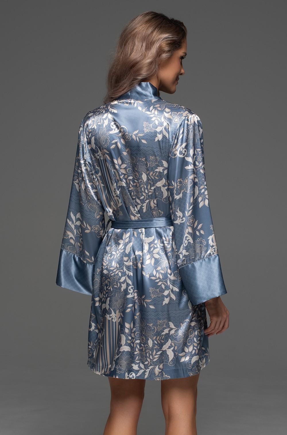 Короткий запашной халат Mia-Amore с длинными рукавами выполнен из принтованного смесового шёлка. Широкие манжеты рукавов и планка халата выполнены из принта-компаньона в виде сот. Халат комплектуется поясом с декоративными кисточками, в боковых швах карманы.