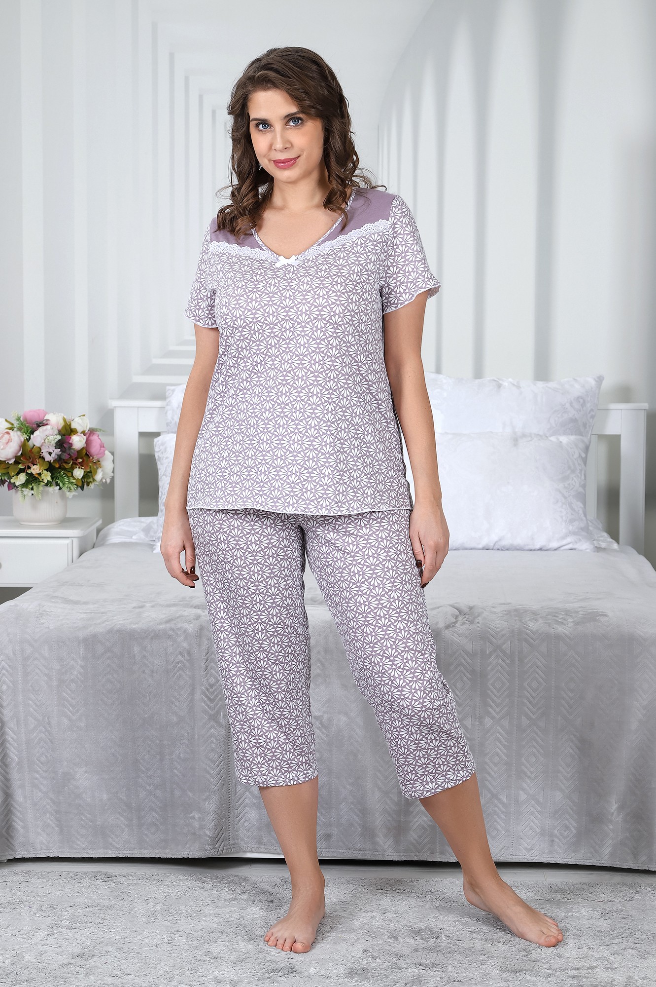 Пижама молодежная из трикотажного полотна «кулирка» в сочетании двух видов полотен гладкокрашенного и с набивным рисунком в единой цветовой гамме, состоящей из футболки и брюк. Футболка из полотна с набивным рисунком свободного покроя, с короткими втачными рукавами, обработанными узкой обметочной строчкой, горловиной V-образной формы, окантованной основным материалом. Полочка- с двумя косыми кокетками и кружевом в швах соединения кокеток с основной деталью, в центре горловины декоративный бантик.Бриджи – из набивного полотна свободного покроя, на притачном поясе с эластичной тесьмой внутри.