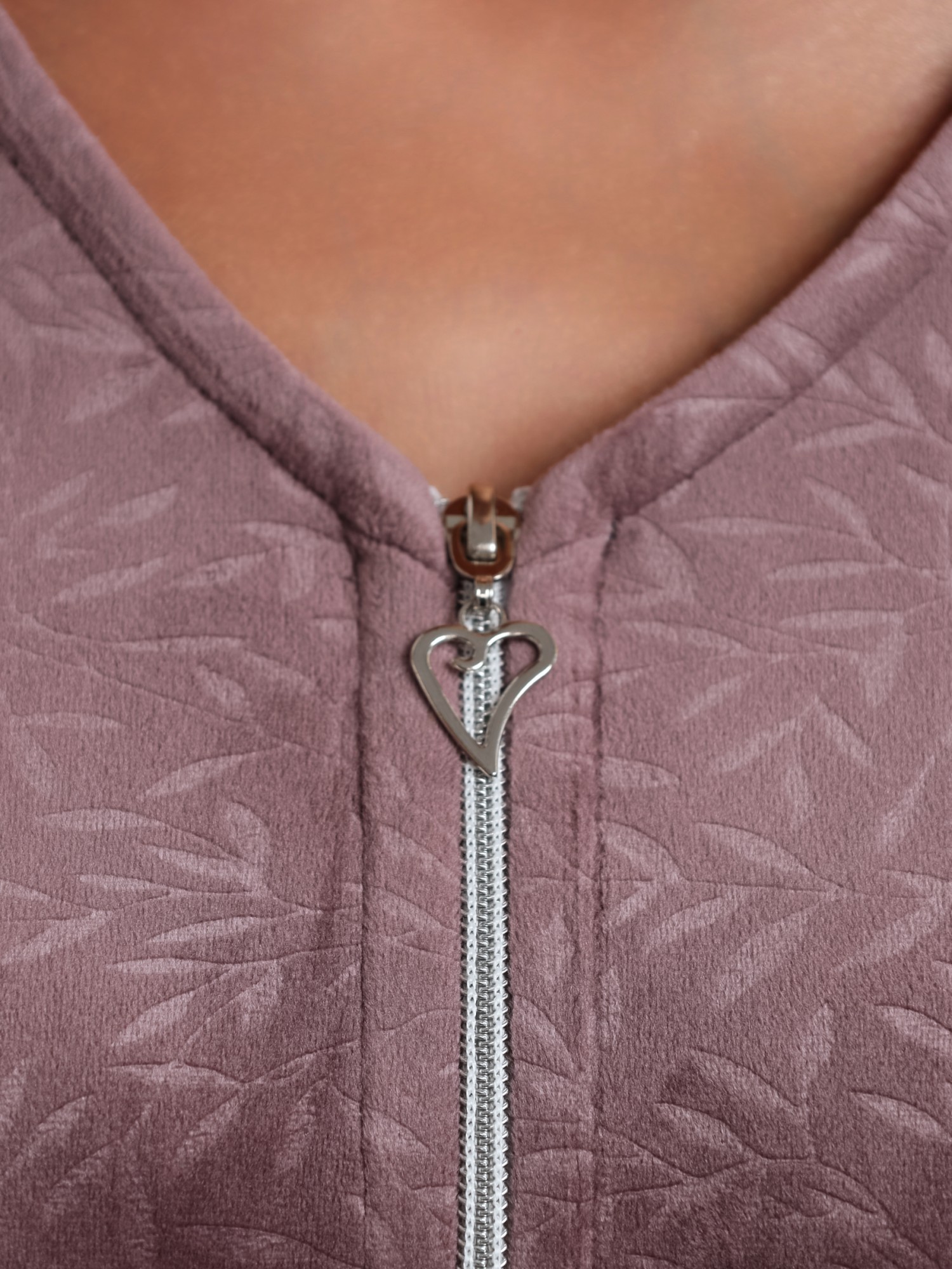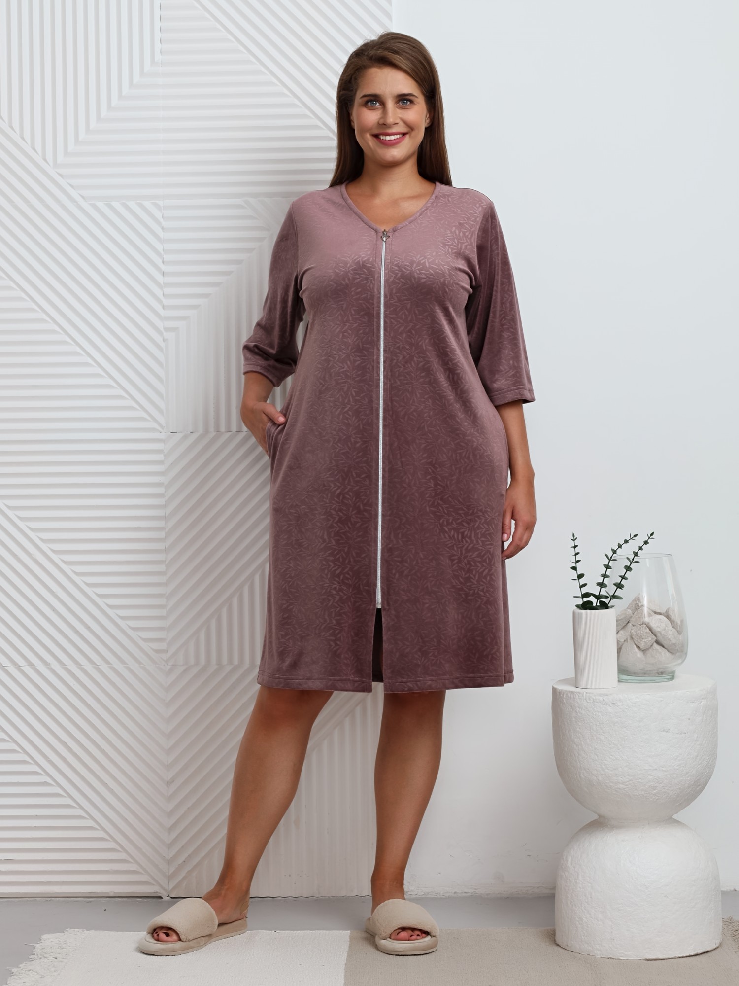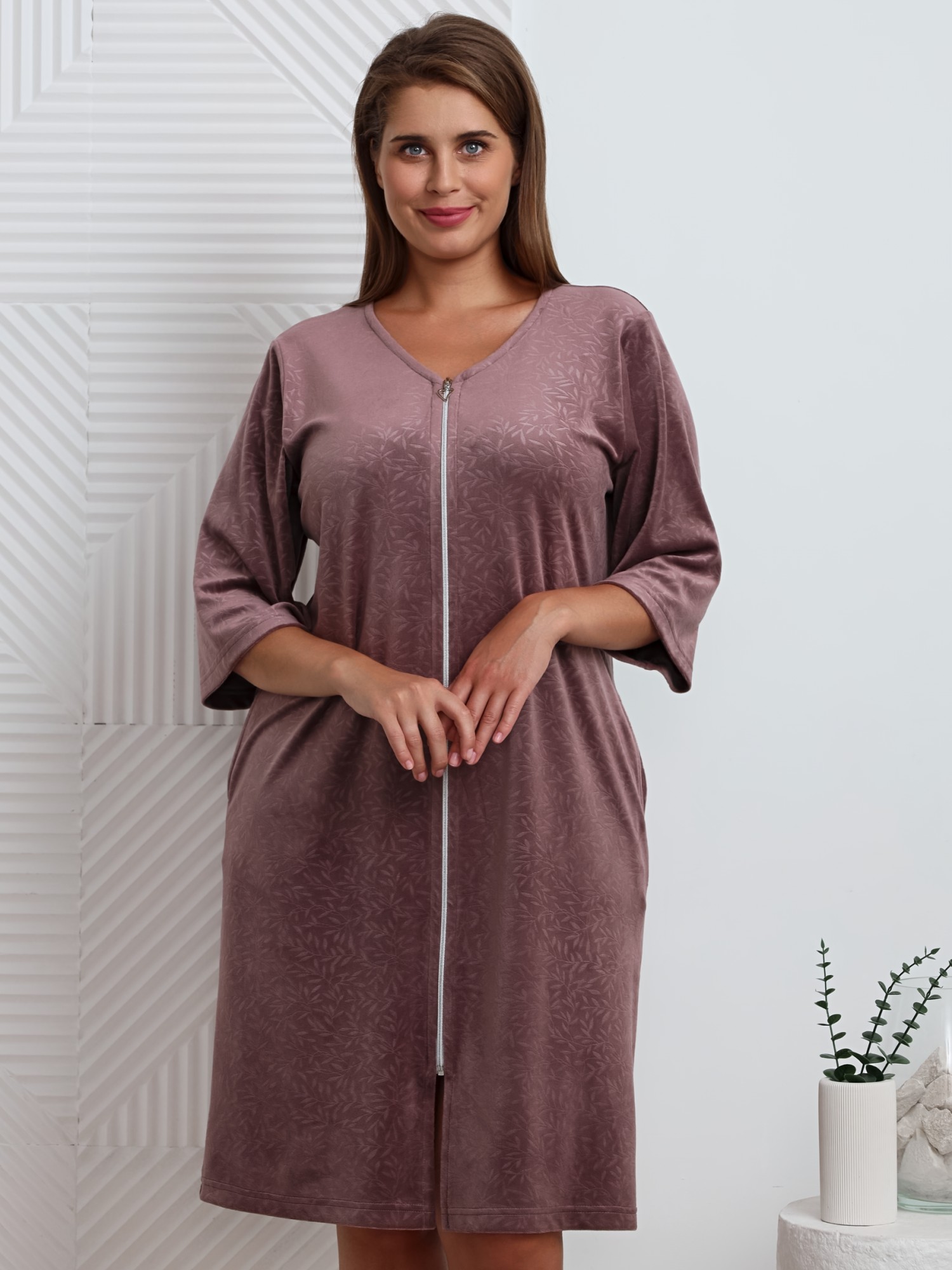 Халат женский из гладкокрашеного полотна «велюр» с рисунком, выполненным тиснением на термопрессе. Изделие прямого силуэта, с втачными рукавами длиной ¾, горловиной овальной формы, карманами в боковых швах и центральной бортовой застежкой на тесьму «молния».