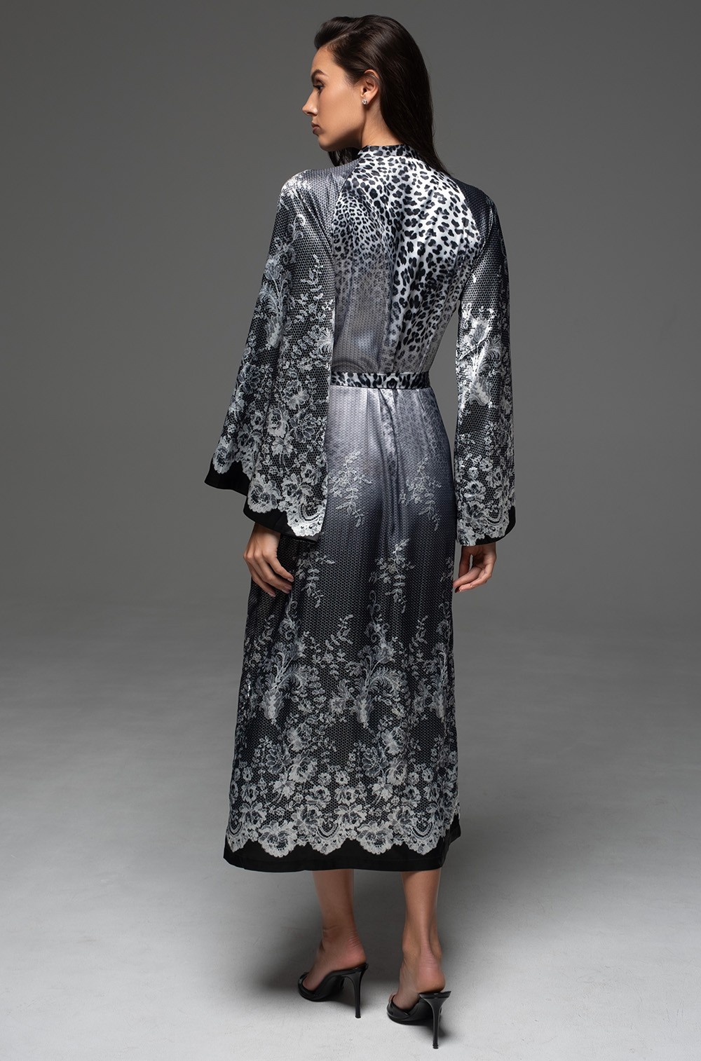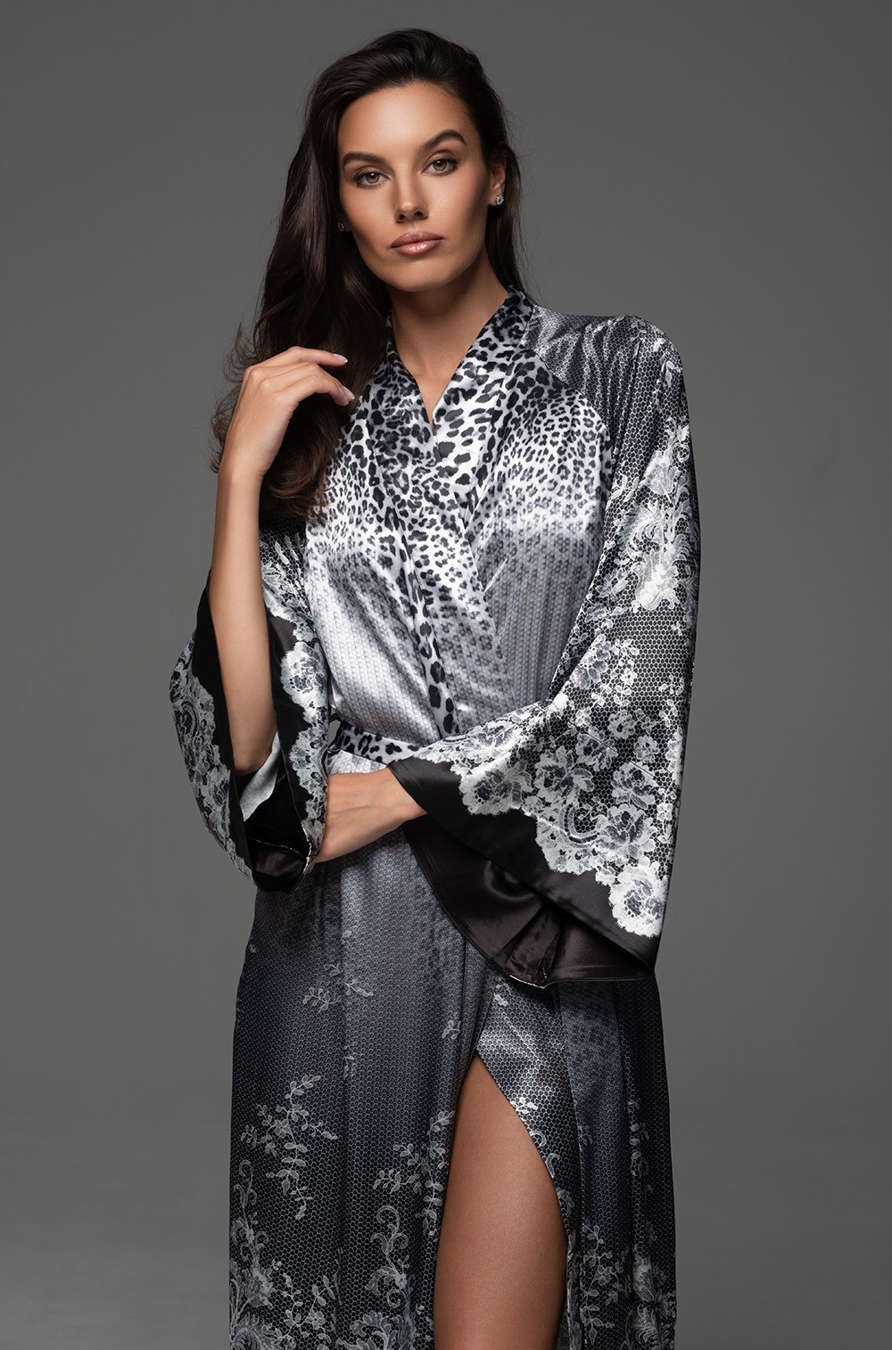 Длинный запашной халат Mia-Amore с длинными рукавами выполнен из принтованного смесового шёлка. Широкие по низу рукава халата и низ изделия декорированы принтом в виде купонного кружева. Халат комплектуется поясом с декоративными кисточками, в боковых швах карманы.