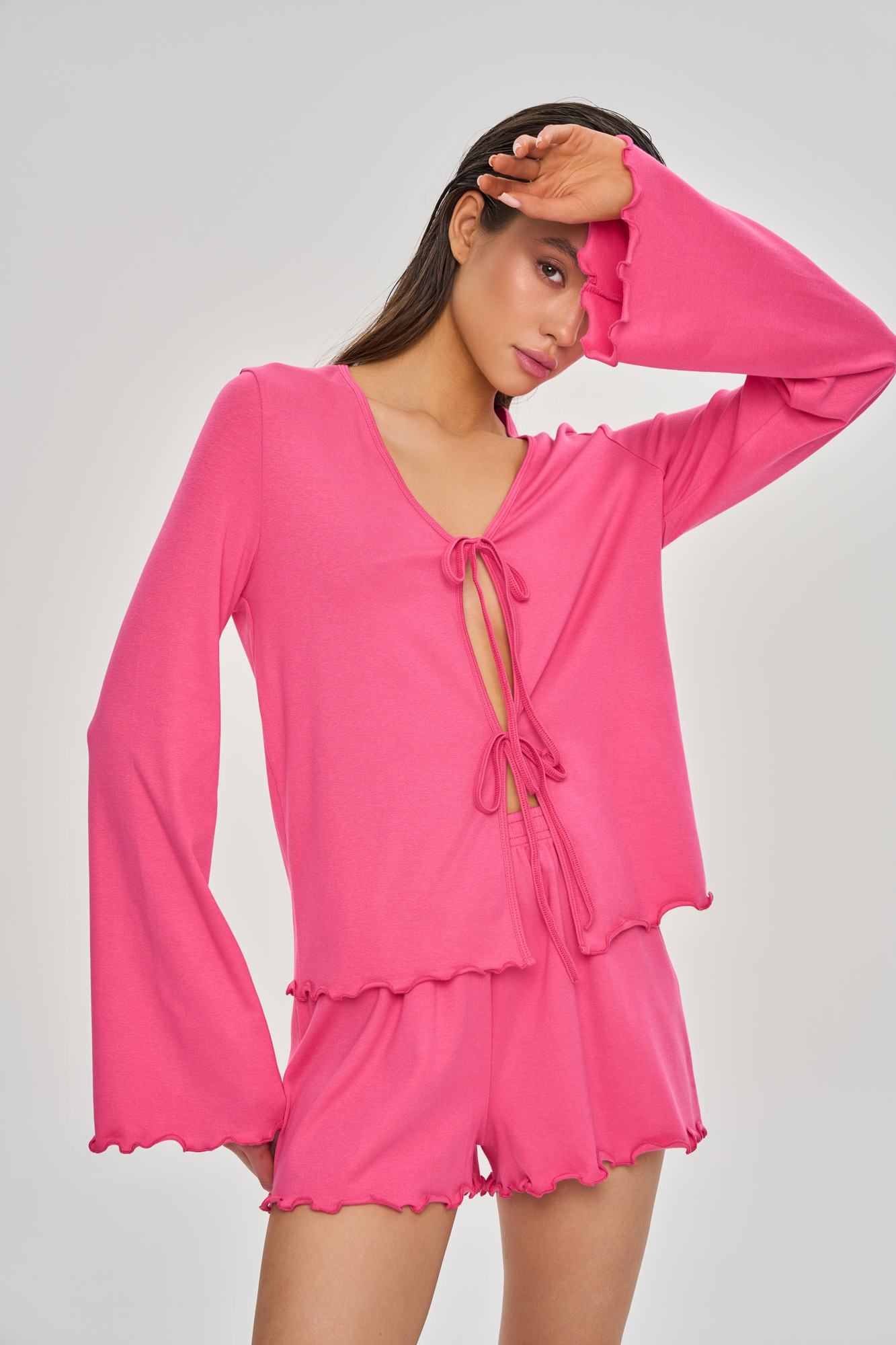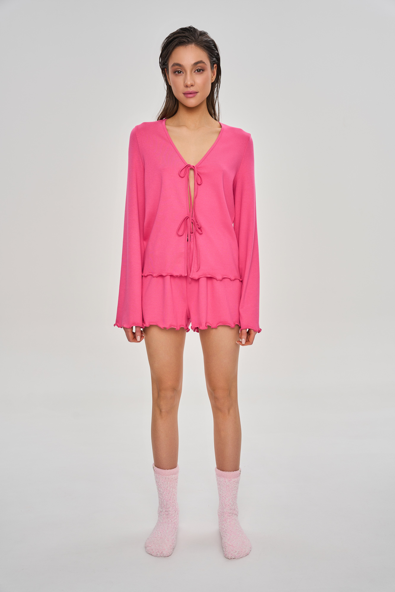 Комплект состоит из лонгслива свободного кроя на декоративной завязке и свободных шортиков.
