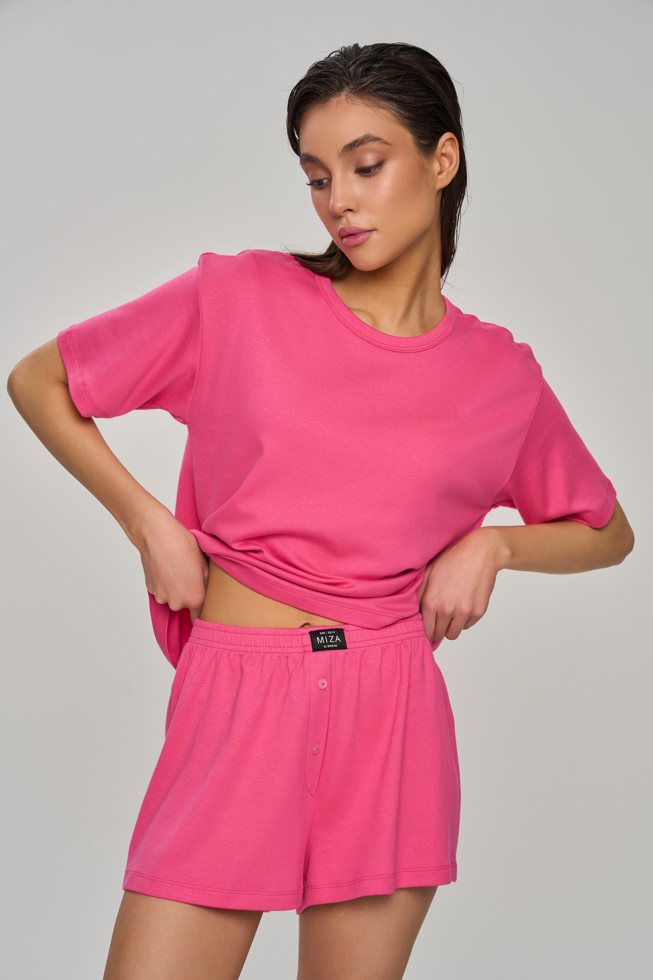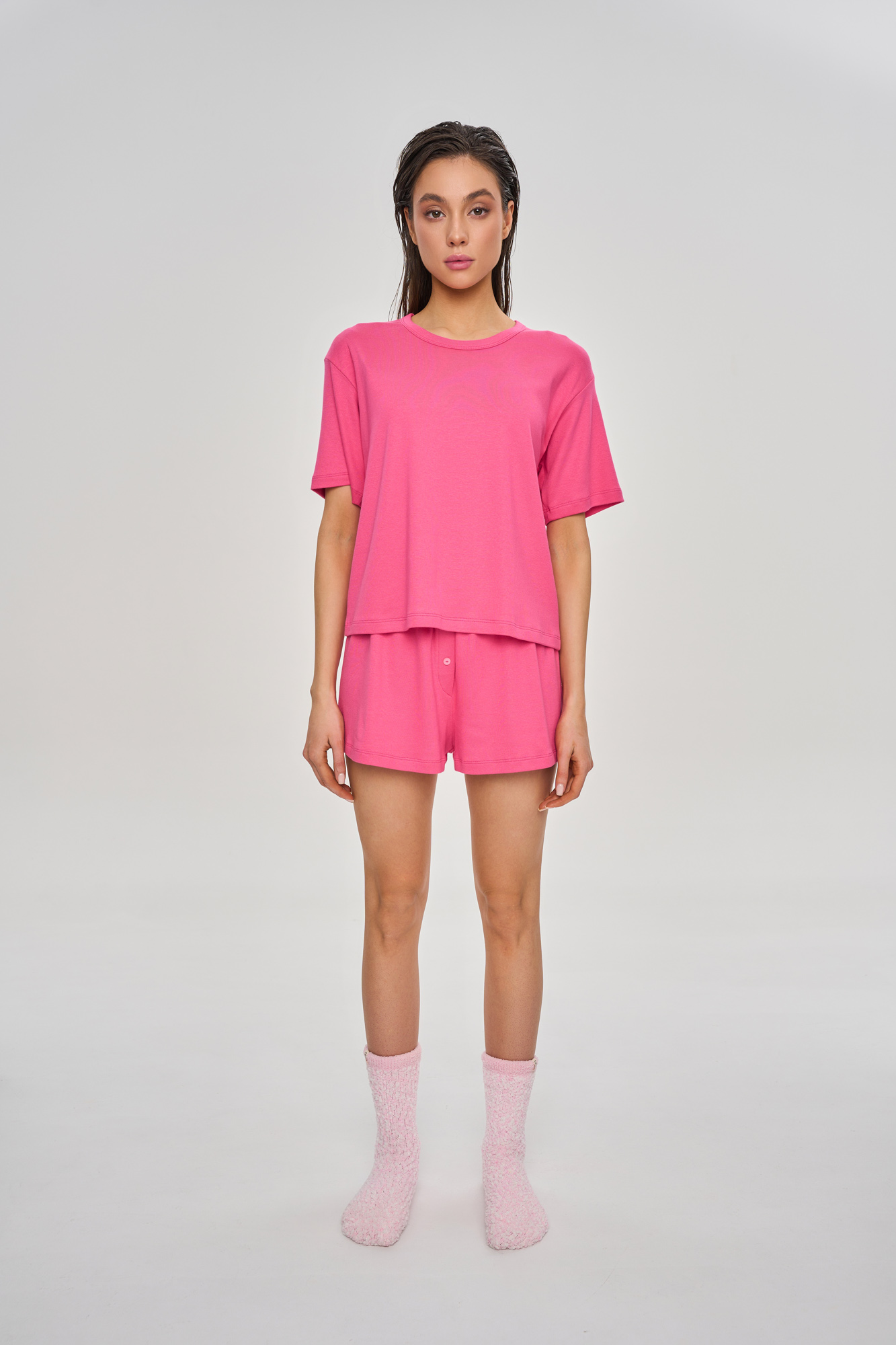 Комплект состоит из укороченной футболки свободного кроя и прямых свободных шортиков с имитацией гульфика.