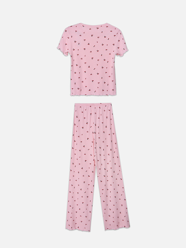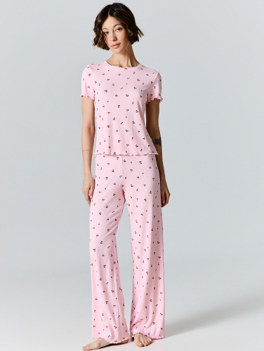Розовый домашний комплект с принтом вишенок выполнен из мягкой рибаны, которая обладает приятной эластичностью и нежно облегает тело, не стесняя движений.