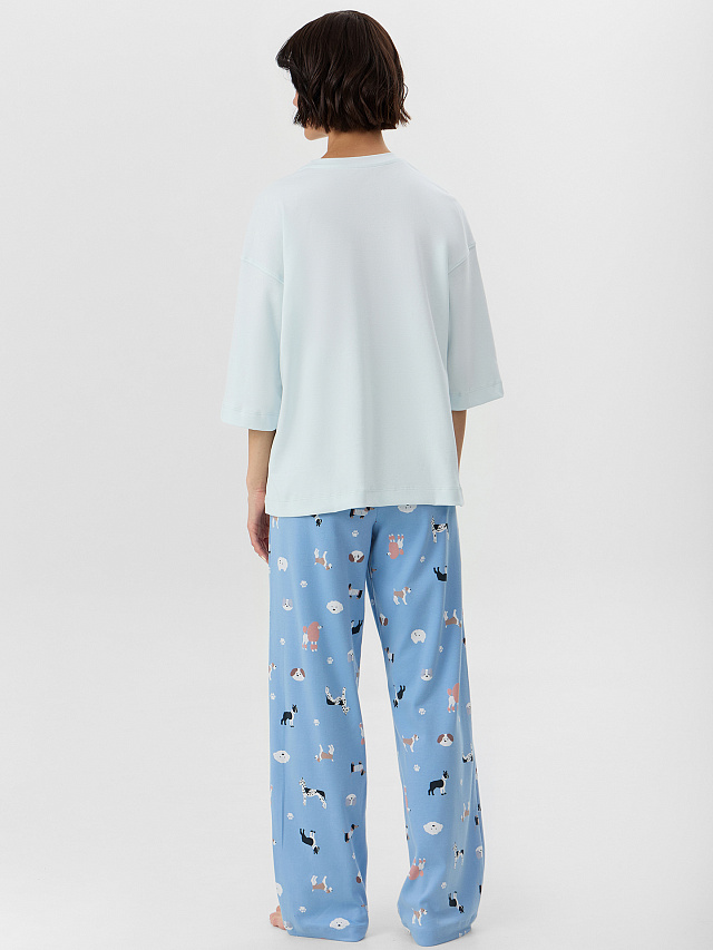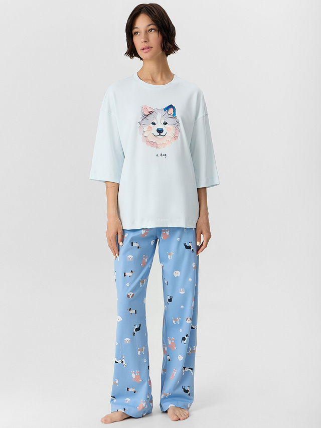 Пижама женская с брюками голубая с принтом – уютный комплект для комфортного отдыха. В комплект входит свободная футболка с надписью "A dog" ("Cобака") и прямые брюки с очаровательными принтами собак.