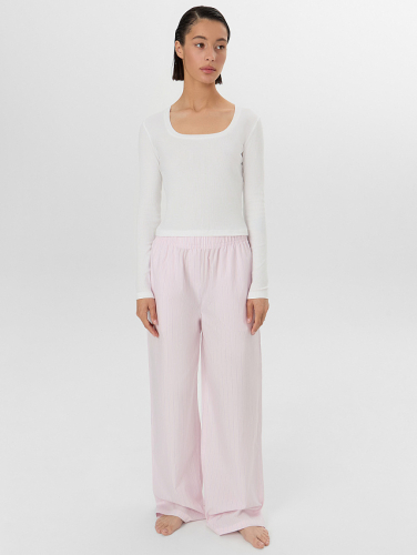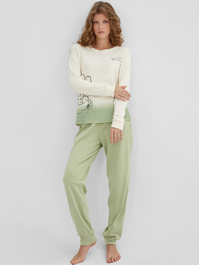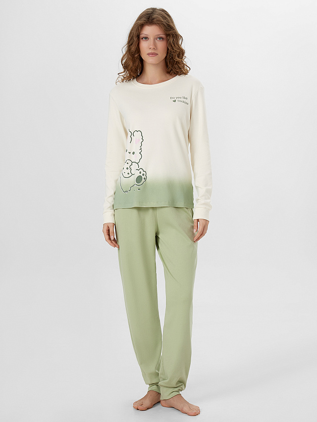 Модель, выполненная из высококачественного хлопка, станет отличным вложением в ваш гардероб. Джемпер свободного силуэта с круглой горловиной создаёт нежный и элегантный образ. А прямые брюки с эластичным поясом идеально садятся по фигуре, не сковывая движений и дарят чувство лёгкости и свободы. Эта мягкая и комфортная пижама идеальна для сна, отдыха и домашних дел. Она сочетает в себе стиль и функциональность, позволяя вам выглядеть прекрасно в любой ситуации.