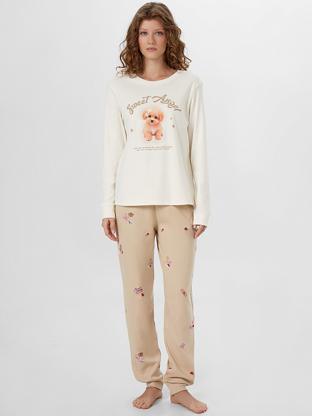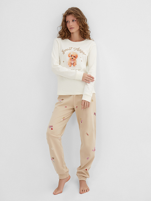 Модель, выполненная из высококачественного хлопка, станет отличным вложением в ваш гардероб. Джемпер свободного силуэта с круглой горловиной создаёт нежный и элегантный образ. А прямые брюки с эластичным поясом идеально садятся по фигуре, не сковывая движений и дарят чувство лёгкости и свободы. Эта мягкая и комфортная пижама идеальна для сна, отдыха и домашних дел. Она сочетает в себе стиль и функциональность, позволяя вам выглядеть прекрасно в любой ситуации.