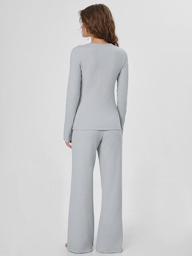 Серая домашняя пижама для женщин, состоящая из джемпера и брюк, создает гармоничный образ для уютного отдыха. Приталенный джемпер с изящным V-образным вырезом мягко подчеркивает силуэт, а длинные рукава обеспечивают комфорт. Элегантную деталь добавляет застежка на кнопки по переду, которая не только функциональна, но и становится стильным акцентом.
