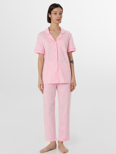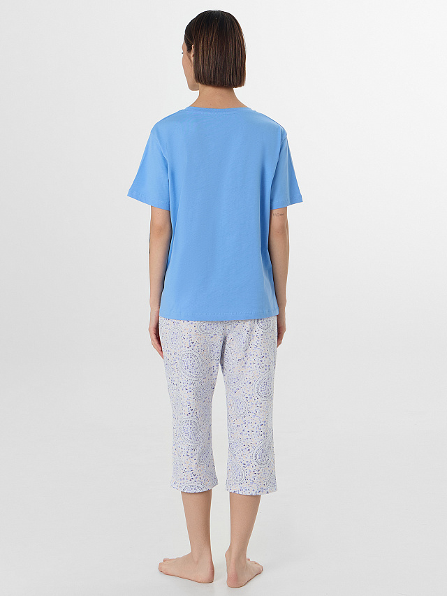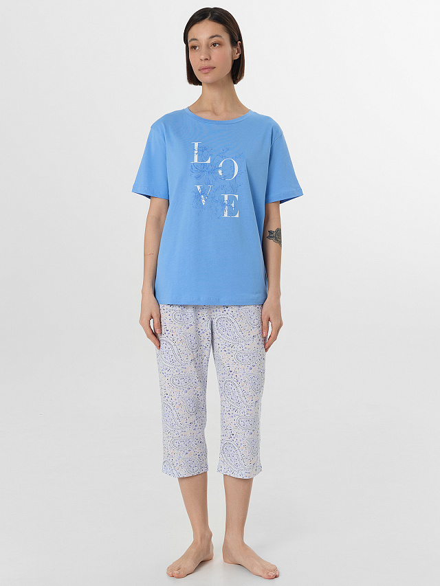 Синий домашний комплект — это удобный набор из джемпера с коротким рукавом и прямых бриджей для комфортного отдыха. Он выполнен из мягкого хлопка, который нежно облегает тело и позволяет коже свободно дышать.
