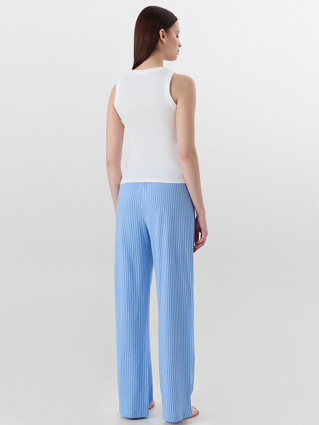 Топ с открытой линией плеча и глубокими проймами мягко подчеркивает силуэт, а аккуратная окантовка всех краев делает его вид законченным и аккуратным. Брюки свободного кроя с широким поясом на мягкой резинке обеспечивают полную свободу движений, не стягивая и не сковывая.