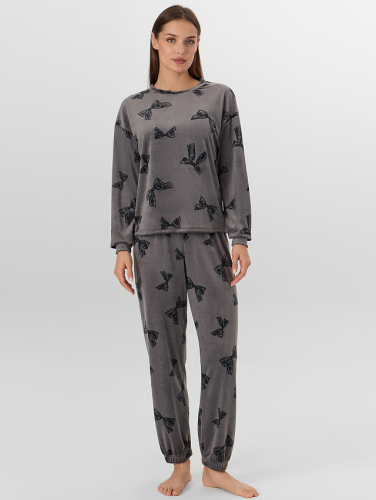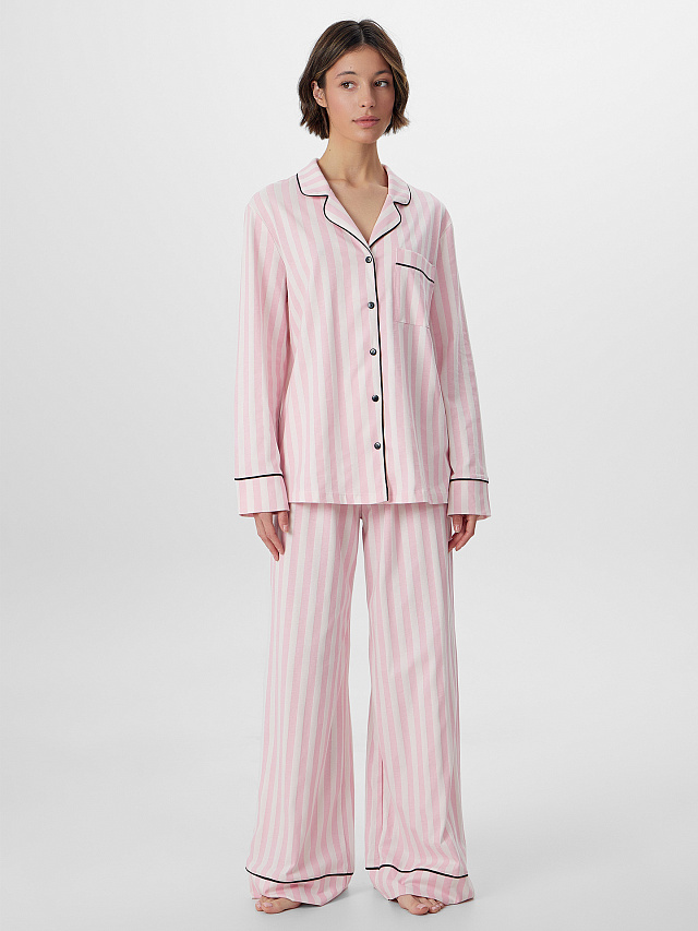 Брюки прямого свободного кроя с средней посадкой на талии создают максимальный комфорт. Широкий пояс со скрытой мягкой резинкой бережно облегает фигуру, не создавая давления, а элегантные отрезные манжеты по низу с контрастными кантами гармонично завершают образ. Пижама обладает исключительной мягкостью, не вызывает раздражения кожи, сохраняет форму после многократных стирок.